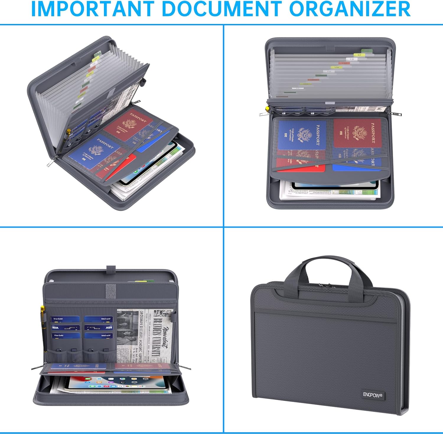 - Accordion File Organizer: A Safe Enough Folder to Keep Your Files. Say goodbye to cluttered files and disorganization with ENGPOW's file organizer folders. Compared with other folders,our fireproof folders is allows you to neatly store and classify letter/A4 files, receipts, cards, USB drives, pen, passports and more in a safe and orderly way. Perfect for daily file filing and storage.The Non-dusty material can prevent dust from sticking to the outside of our folder,always keep it neat and tidy.