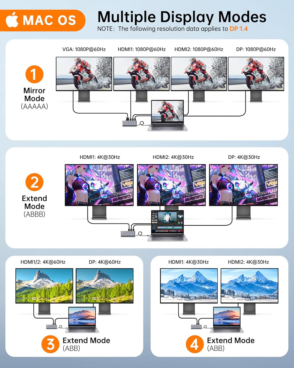 - 【4K@30Hz Triple Display Docking Station 3 Monitors】NOVOO USB C Docking Station will hook up triple displays to dual HDMI and DP in 4K@30Hz (DP1.4 Source).★★Windows System support MST and SST(Mirror & Extend Mode). All MacBook laptop only supports SST mode, MAC OS can only extend one monitor. Single DisplayPort support up to 8K@30Hz. With this USB C Dock, you can enjoy an 8K ultra high definition movie experience and 3D visual effects