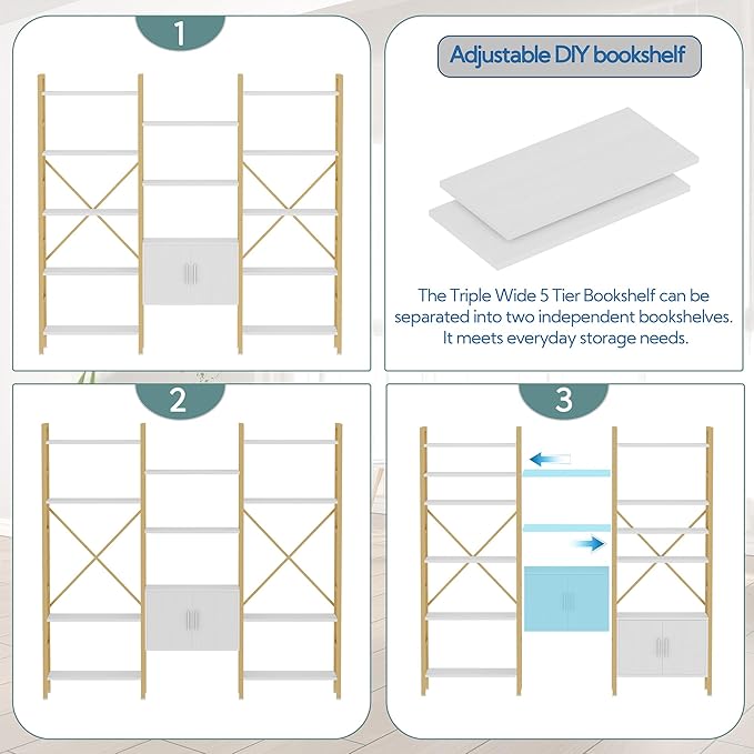Yusong Bookshelf Triple Wide 5 Tier Bookcases with Storage Cabinet, Industrial Large Modern Tall Bookshelves with 12 Open Display Shelves for Living Room Office Bedroom, White and Gold