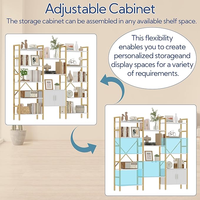 - 【Adjustable Shelves & Storage Cabinet】Unlike fixed shelves, this bookcase features adjustable shelves, allowing you to customize the height and placement of each shelf according to your specific needs. Additionally, The storage cabinet can be assembled in any available shelf space. This flexibility enables you to create personalized storage and display spaces for a variety of requirements.
