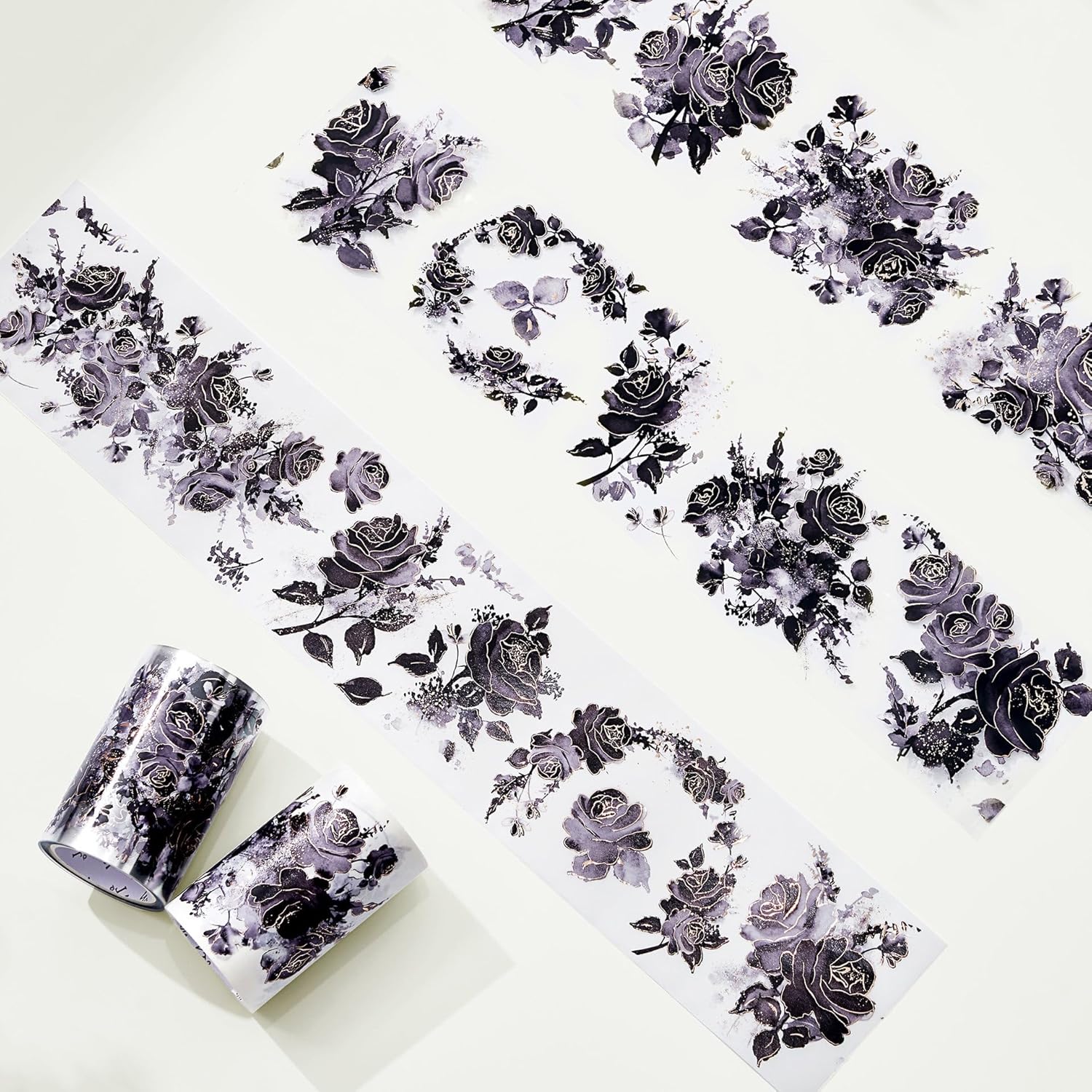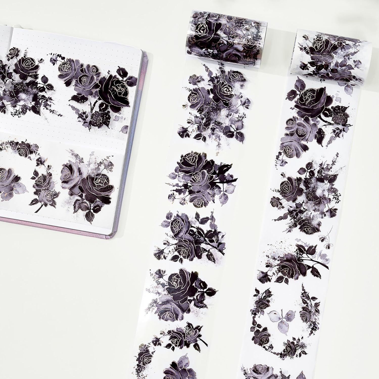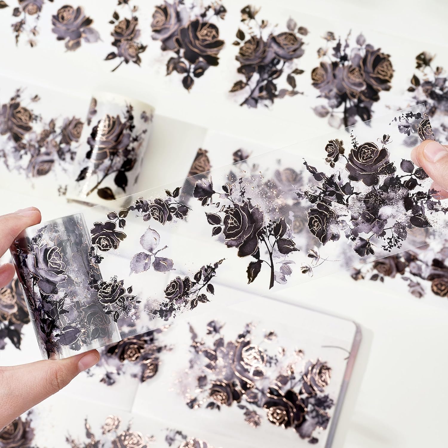 WT Rose Noir Wide PET Tape Gilded,Single Roll,Original Designs,Black Floral Decors,Transparent Clear Adhesive Tape,Gold Foil,Scrapbooks Junk Bujo Journals Planners DIY Crafts Supplies Gifts