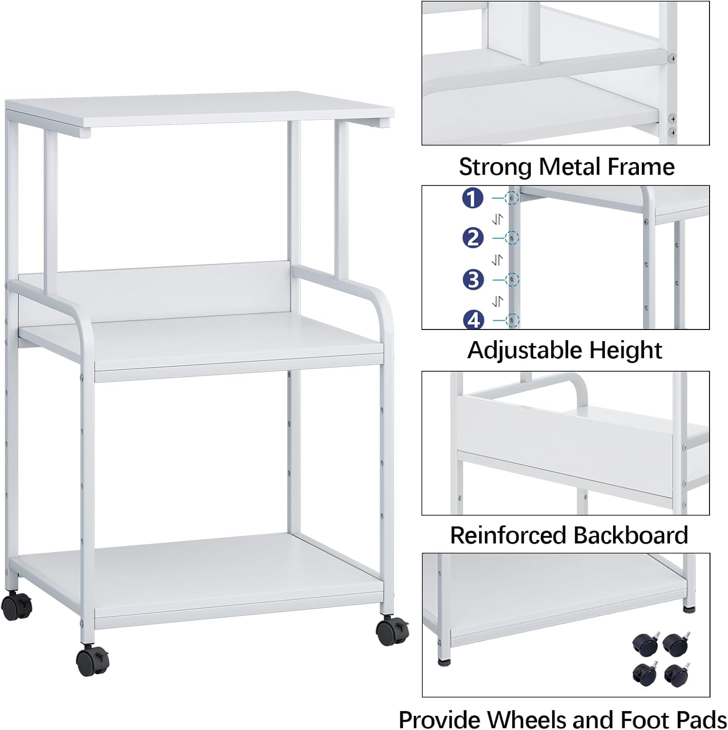 Printer Stand with Storage Shelf,3 Tier Printer Cart with Wheels,Mobile Printer Table for Home Office,Stands for Printer Heat Press Scanner Fax,Industrial Style (White)