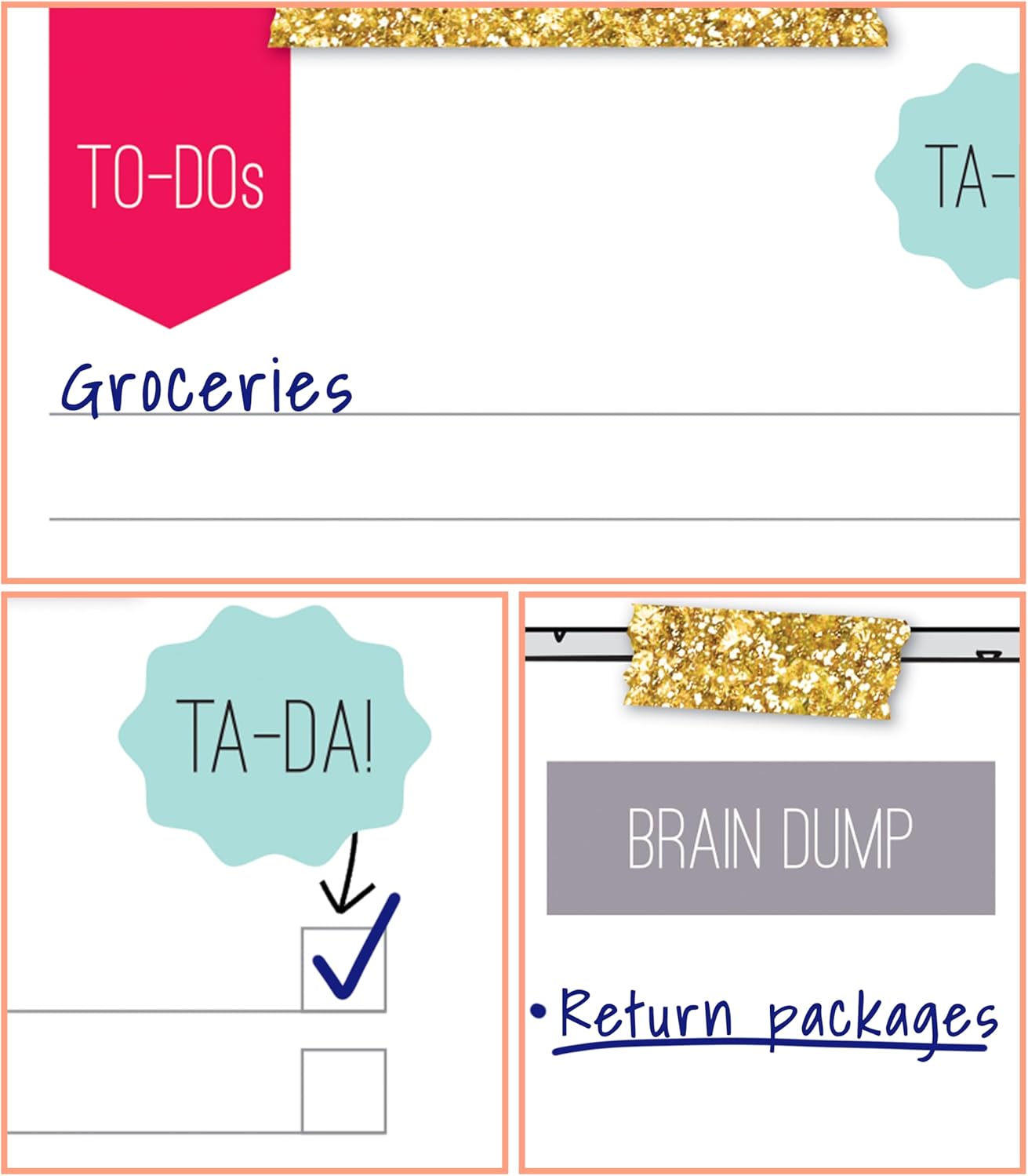 - What’s Included: The stationery set features 3 notepads with 50 sheets of acid-free, lignin-free lined paper per pad with a to-do list and a Brain Dump section to help you organize and conquer your day. The bold style and glitzy washi tape accents make this pack of notepads a daily essential.