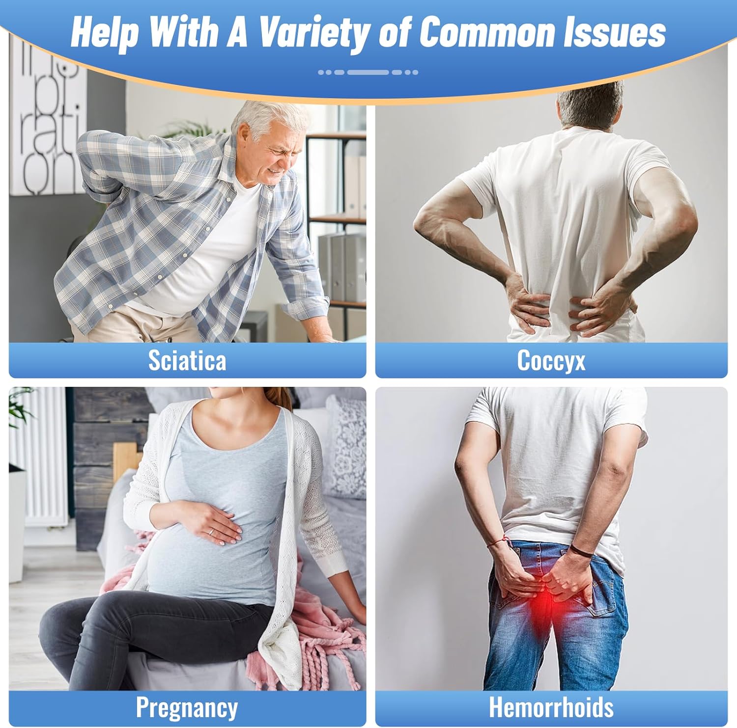 - [Relieve Sedentary Discomfort] Whether you have a desk job or spend long hours sitting, sedentary discomfort is a real issue. Prolonged sitting can lead to a variety of health problems, including lower back pain, hip pressure, and even sciatica. CloudBliss donut pillow is your answer to finding relief from these issues. Its innovative design distributes weight evenly, reducing pressure on the spine and promoting proper posture