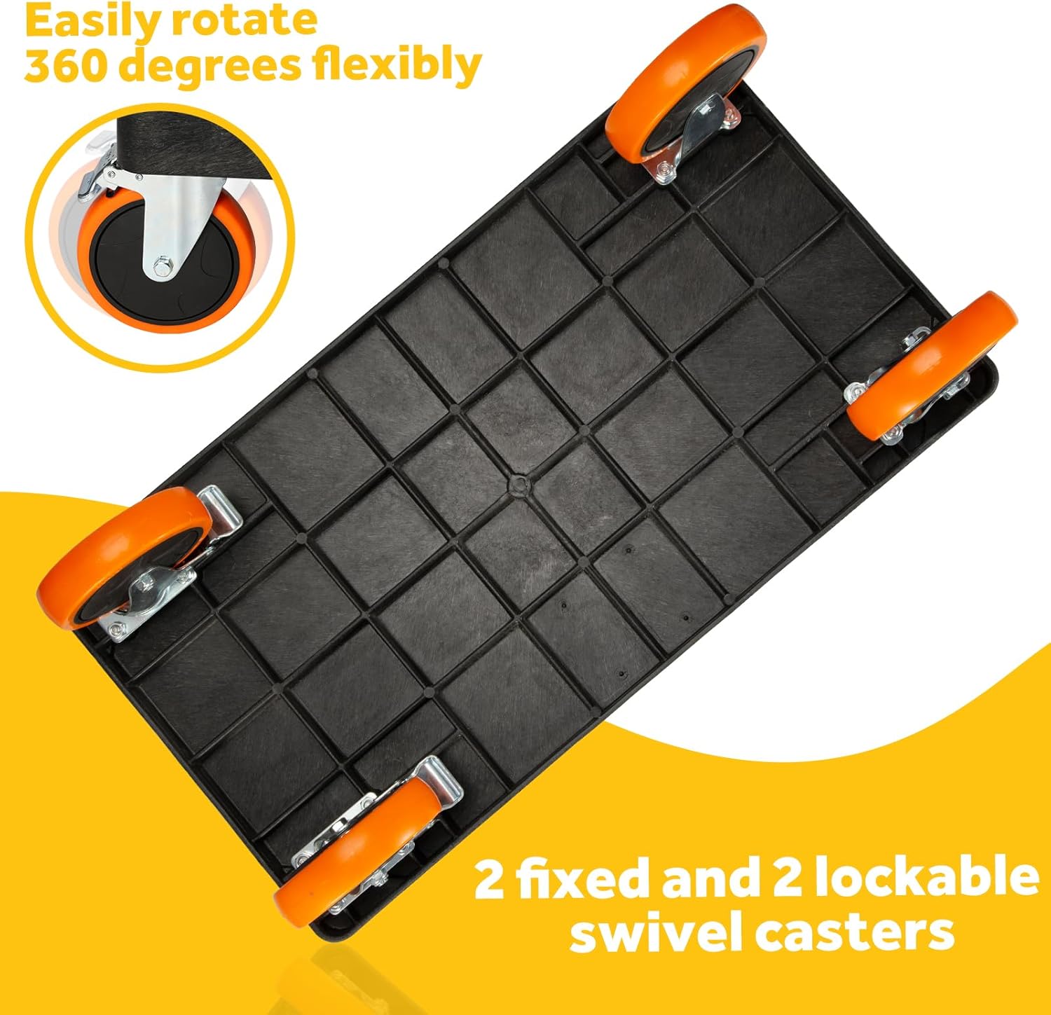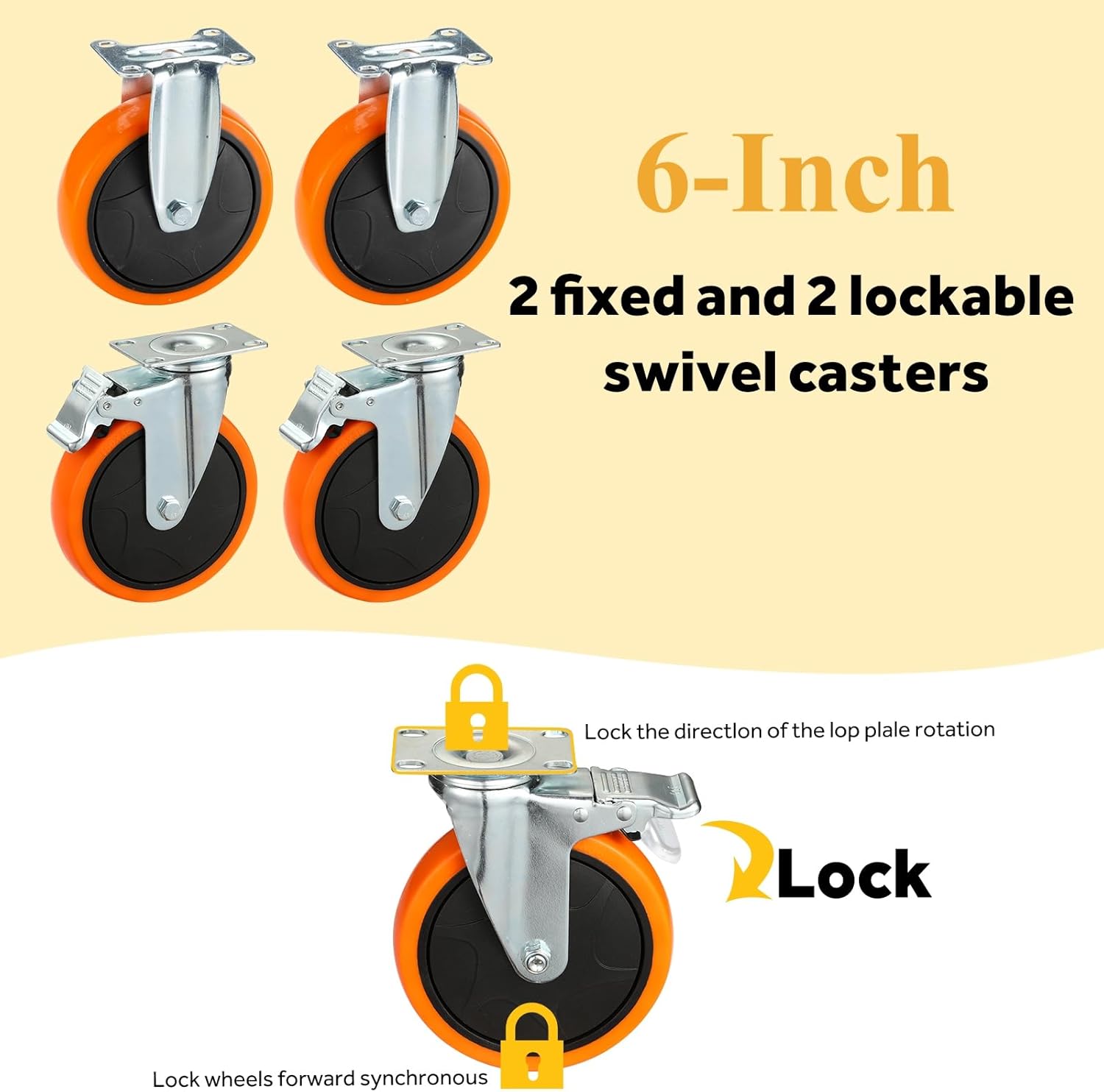 - 🔆 PROFESSIONALLY DESIGNED WHEELS: 2 fixed and 2 swivel 6-inch wheels (2 with Brake) are made of industrial-strength polypropylene and non-marking polyurethane (PU) rubber. The swivel wheels can easily rotate 360 degrees flexibly, and the inner double ball bearings make the rotation and rolling more effortless and labor-saving. The locking mechanism synchronously locks the rotation and the wheel frame, thus achieving effective and fast braking.