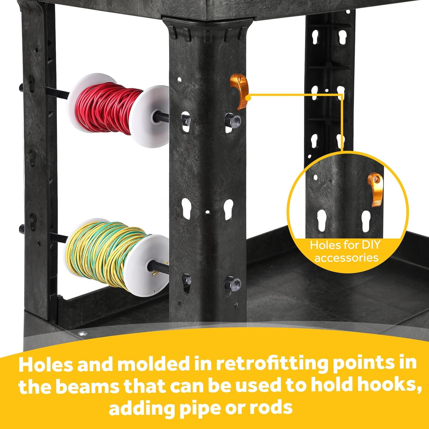- 🔆 ERGONOMIC HANDLE AND CUSTOMIZABLE FITTINGS: Our service cart ergonomic push handle is molded into top shelf with a built-in storage compartment, which provides optimum hand placement and pushing height to improve control & worker safety. Molded In Retrofitting Points in beams allow you to add pipe or rods to hold wire spools and other roll type goods.