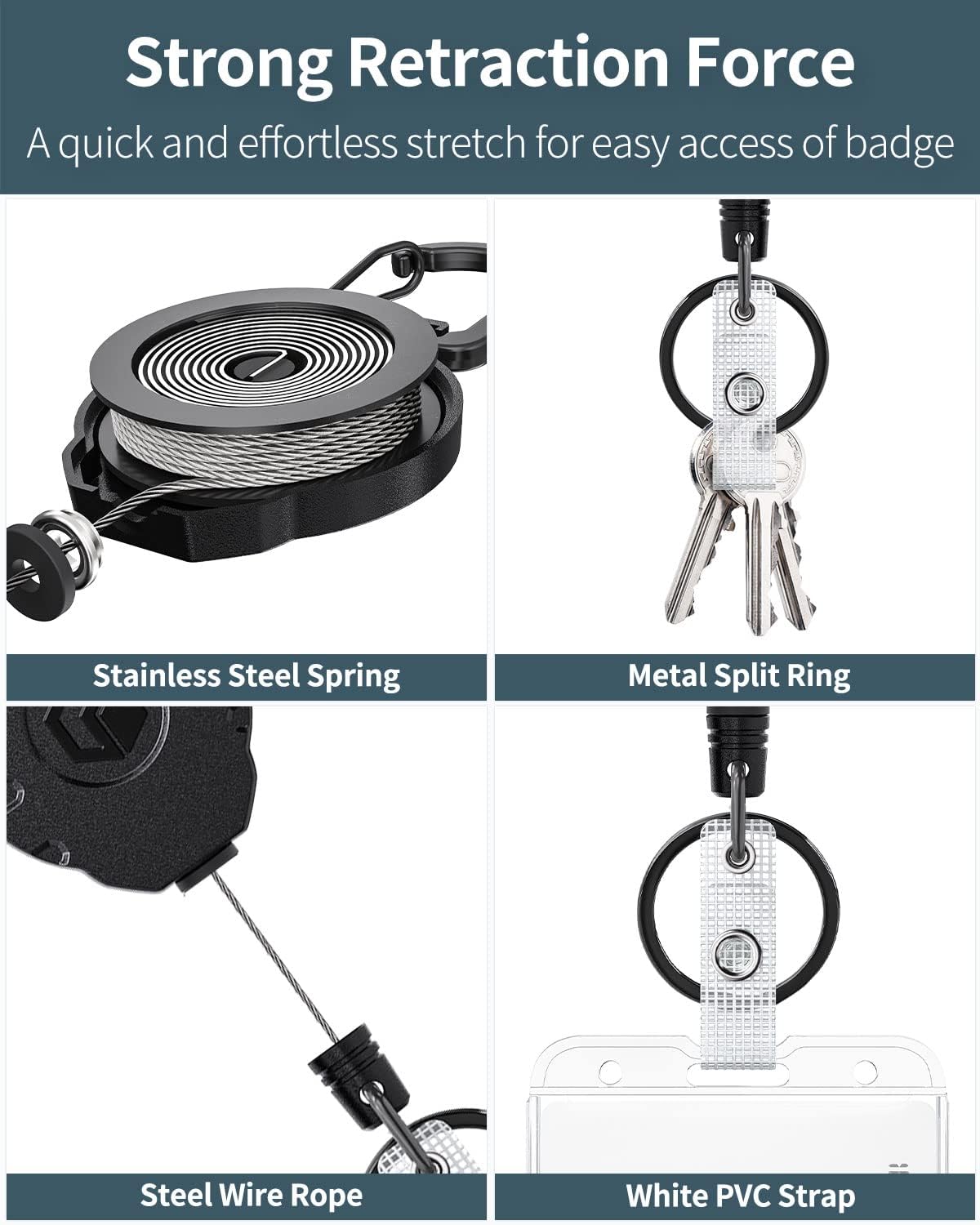 - Retractable Keychain: With built-in stainless steel spring coils, it has strong retraction force to endure pulls over 10,000 times and hold up to 8 oz. The 1 mm steel wire rope can stretch up to 31.5". Easy to open the door without removing the badge or key.
