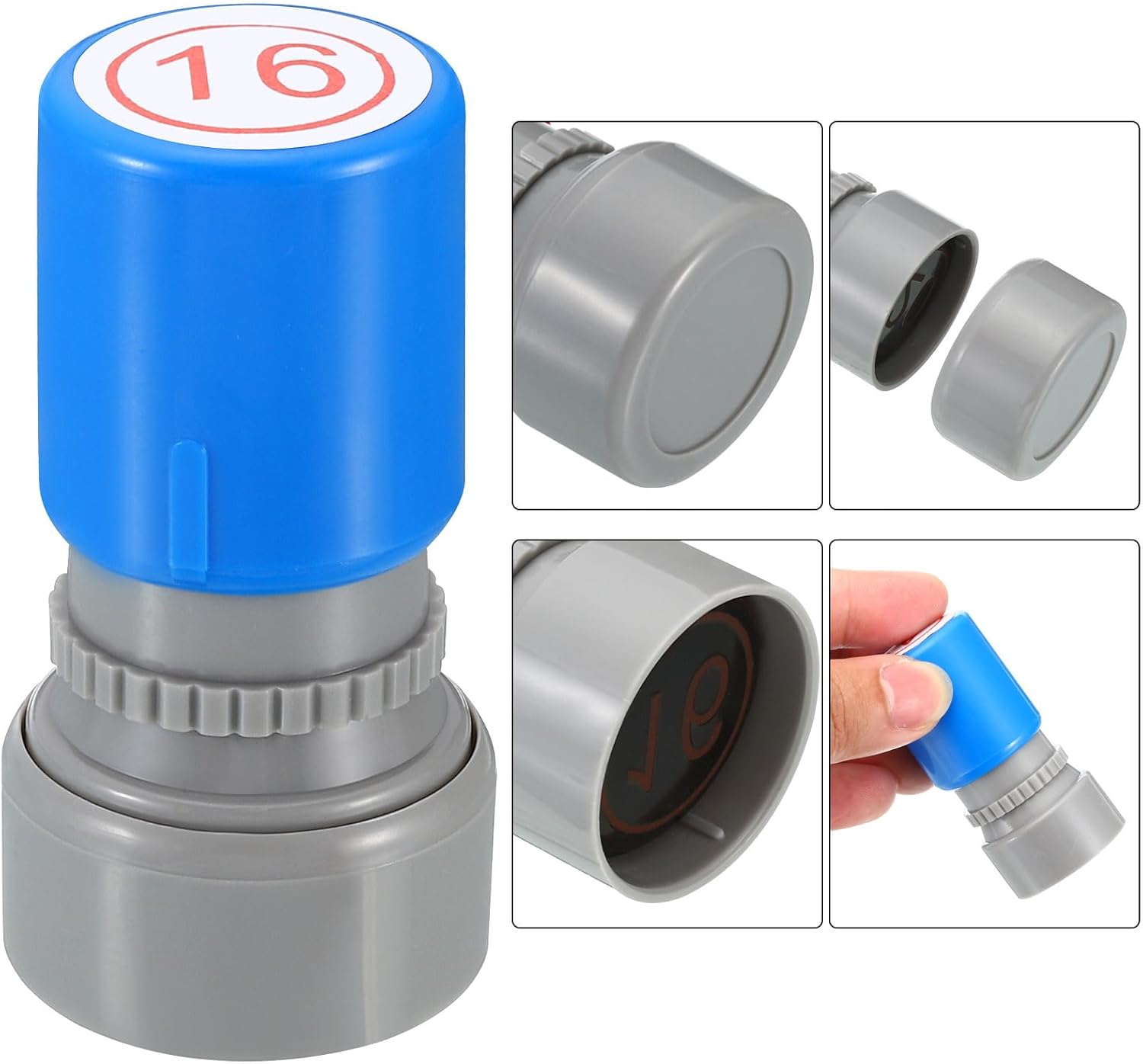 - Ink Color: Red; Shell Color: Blue; Pattern: Digital 16; Material: Plastic; Character Size: 20mm / 0.8 inch; Overall Size: 34 x 63mm / 1.3 x 2.5 inch(D*H); Packing List: 1 x Number Learning Stamp, 1 x Ink