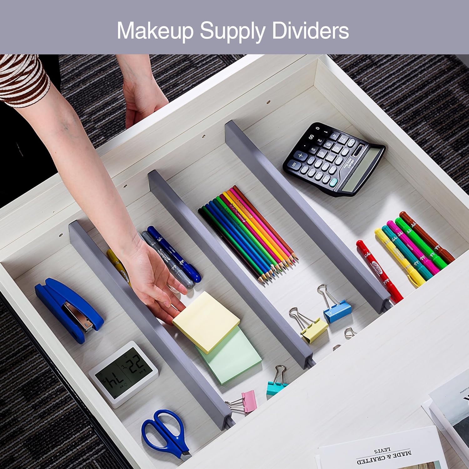 - Product Size: The dividers are adjustable from (16.6" to 21.7")L x 0.6"W x 2.4"H. The product size are not intended for use. Please refer to the recommended drawer dimensions for purchase