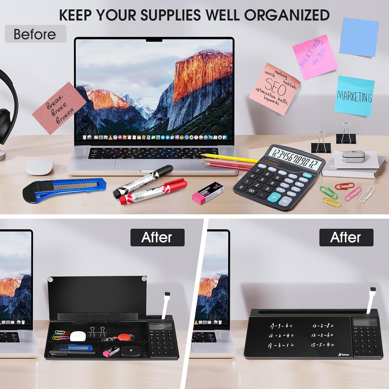 - Multi-functional Design: Sitting compactly between your monitor and keyboard, you can use it as a desk to do list whiteboard, or phone charger, or phone/tablet holder, or keyboard stand. It can used for your office task organization, family schedule and workout plan