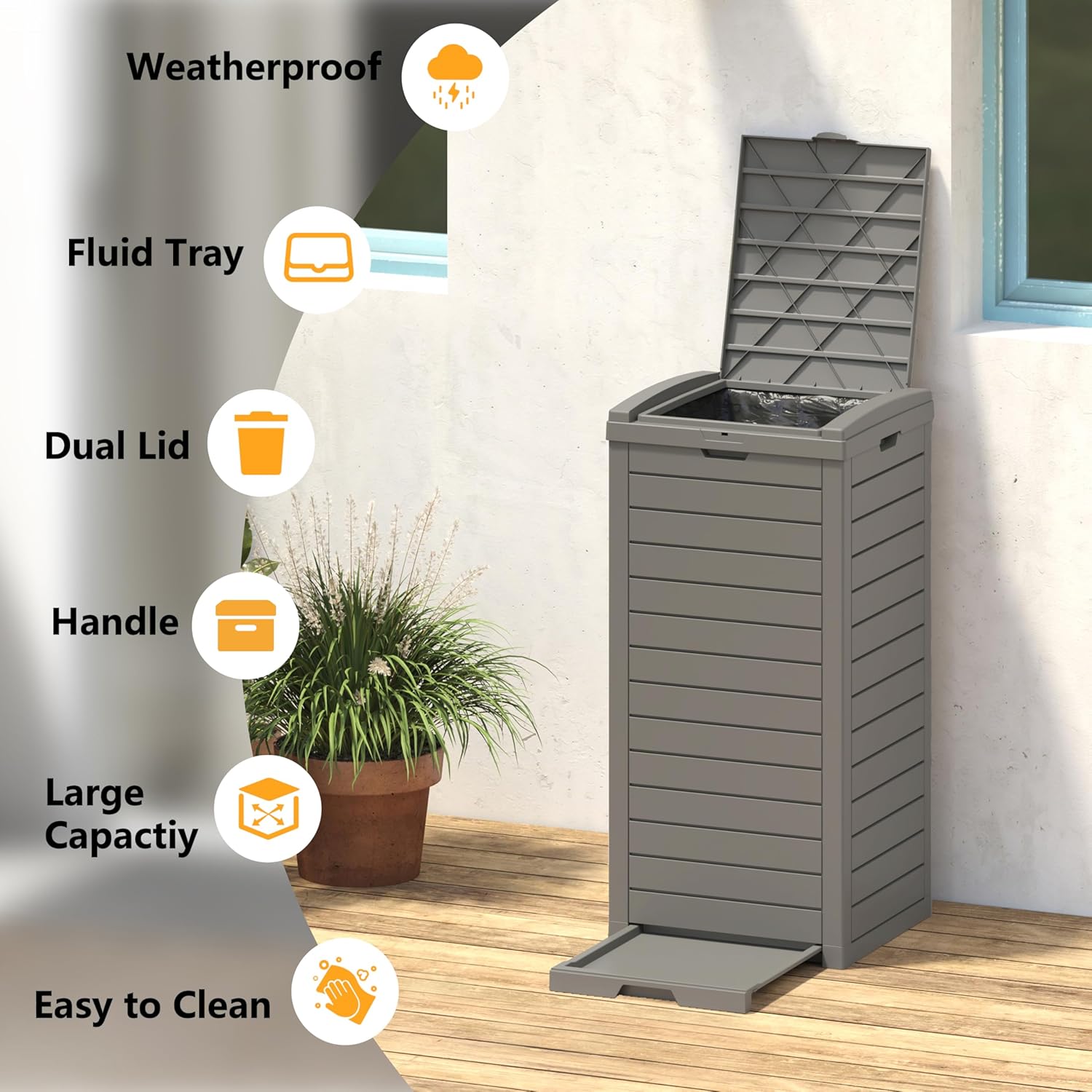 Outdoor Trash Can, 31 Gallon Garbage Can with Tiered Lid and Drip Tray, Waterproof Resin Patio Waste Bin for Garden, Backyard, Deck