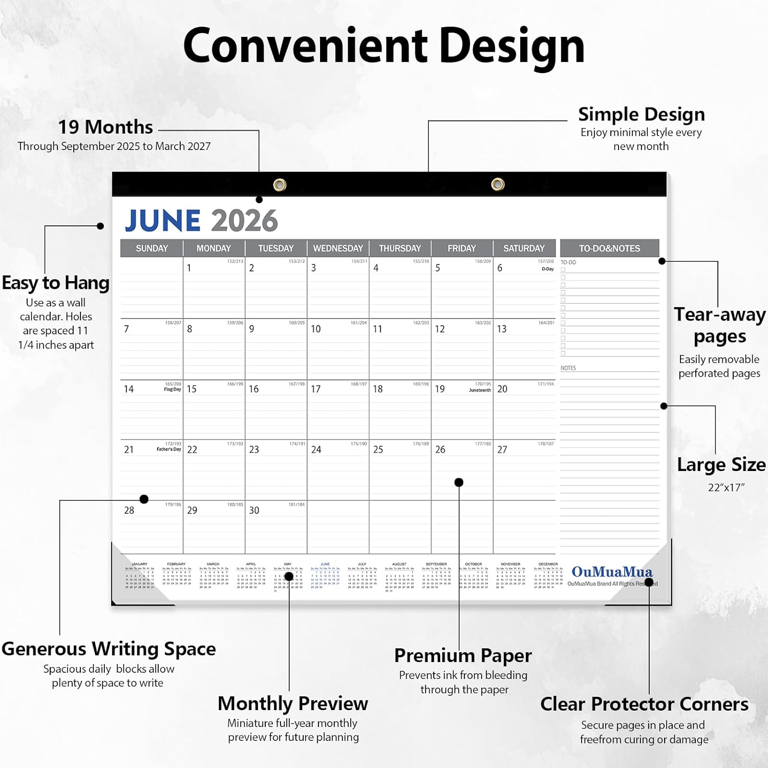 OuMuaMua Large Desk Calendar 2026-19 Months from Sep. 2025 through Mar. 2027, 22 x 17 Inches Desktop Wall Calendar with Julian Date To-do & Notes, Corner Protectors for School Home Office