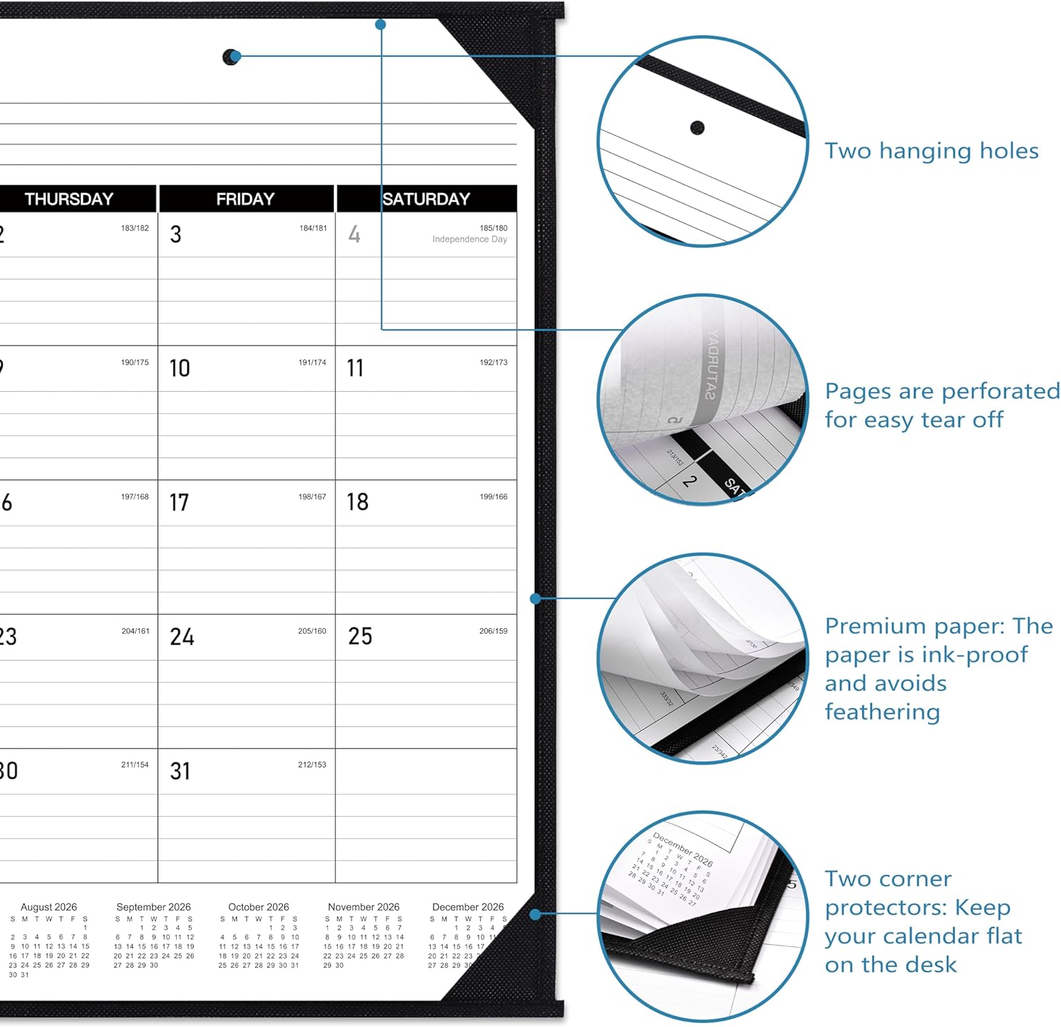 - Function Design - This large desk calendar 2026 can be used to switch between desk calendar or wall calendar as needed. It has two transparent corners and hanging holes. The hanging holes make it easy to use as a wall calendar, and corner guards help keep the paper flat. When the month is over, the pages you can tear them off smoothly and easily, which is a good tool for long-term planning.