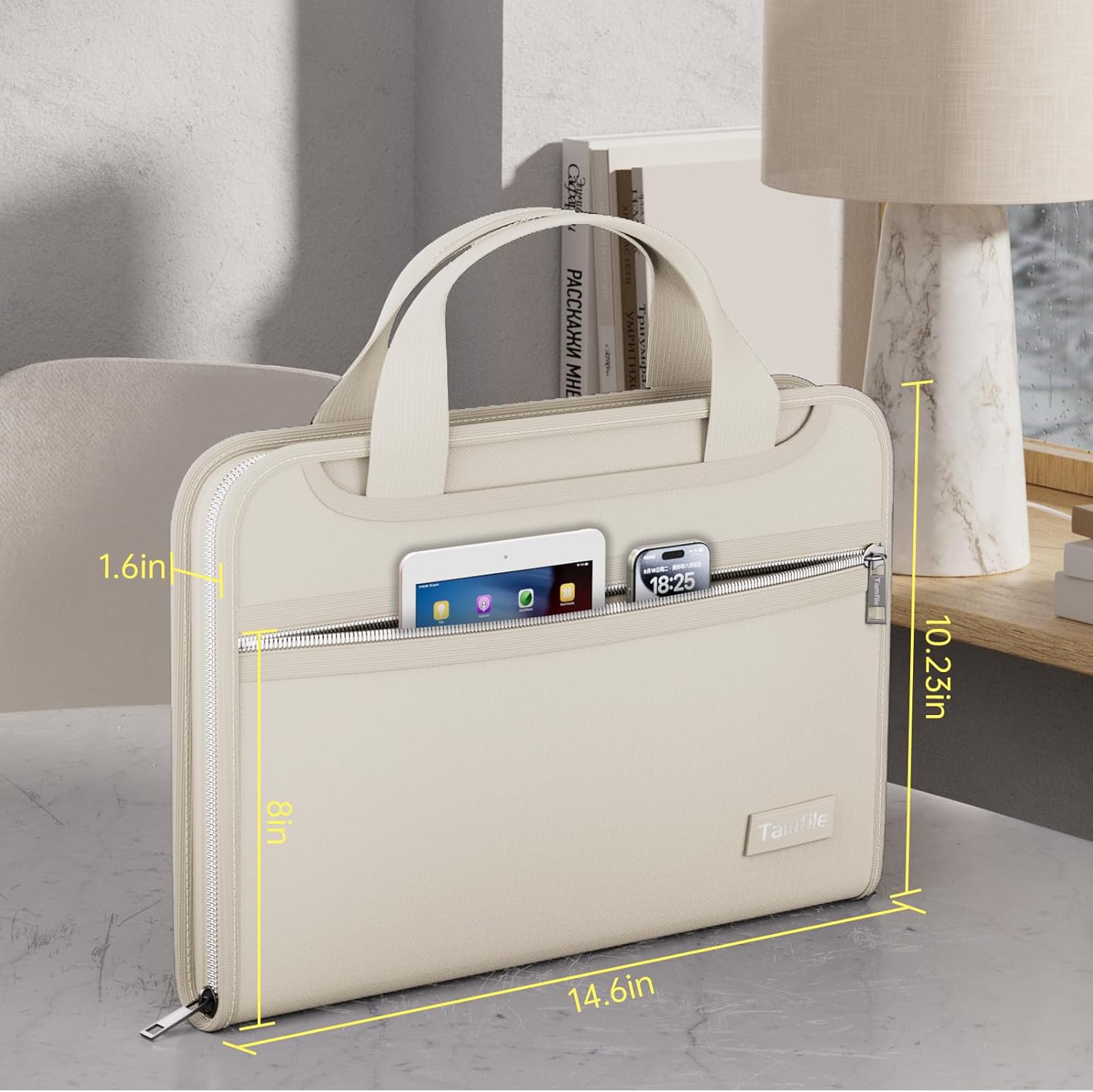 Tamfile Fireproof Accordion File Organizer with Handle, 13 Pocket Expanding File Folder with Zipper & Labels, File Folder with Multi-Pockets Paper Organizer Folder for Letter A4 Files, Beige