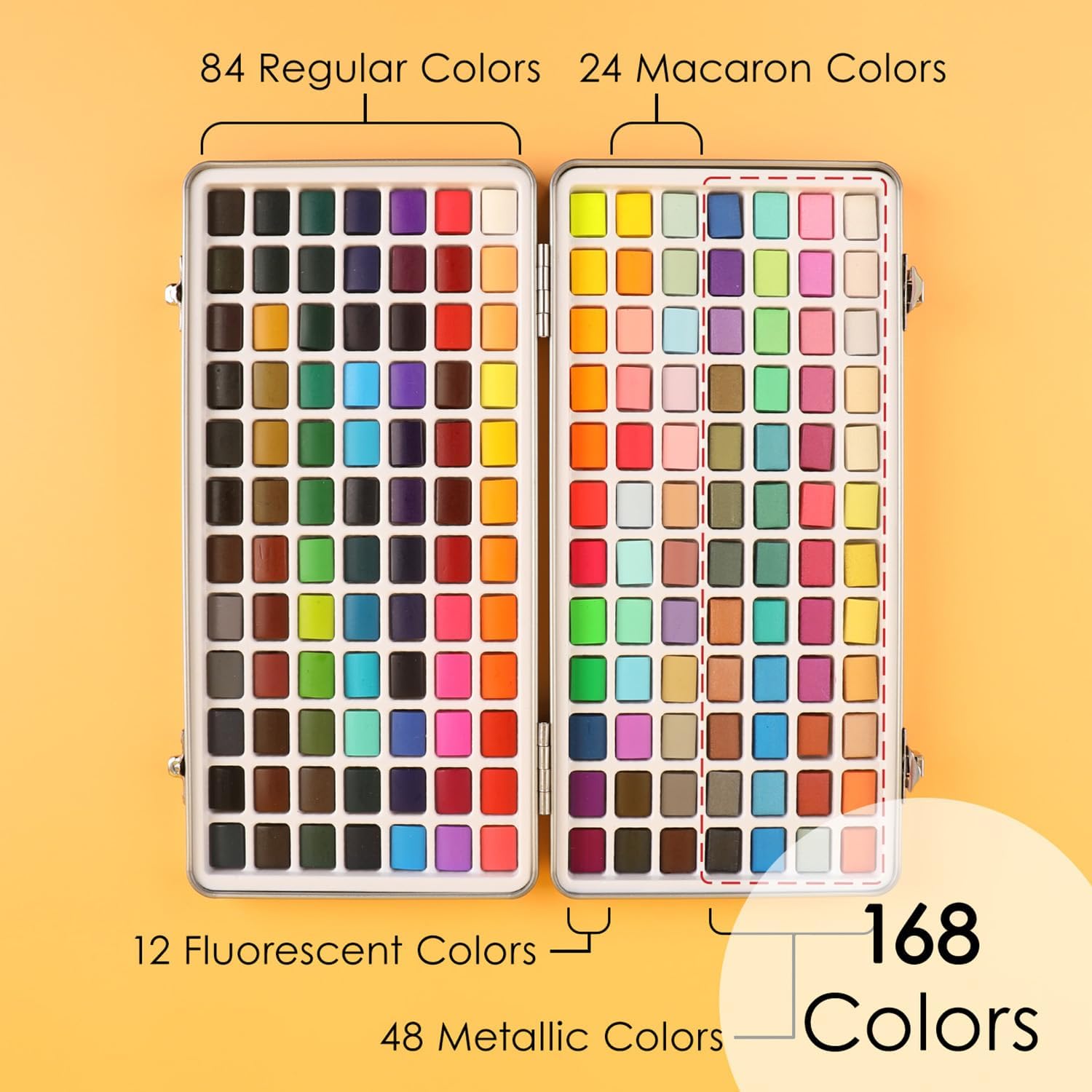 - Multicolor Watercolor Set: includes 84 regular colors, 48 metallic colors, 12 fluorescent colors, and 24 macaron colors, totaling 168 colors. Using high-quality pigments, apply smoothly and evenly. Suitable for various purposes such as design, still life painting, and artists of all levels.