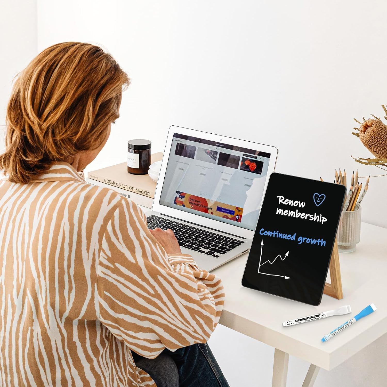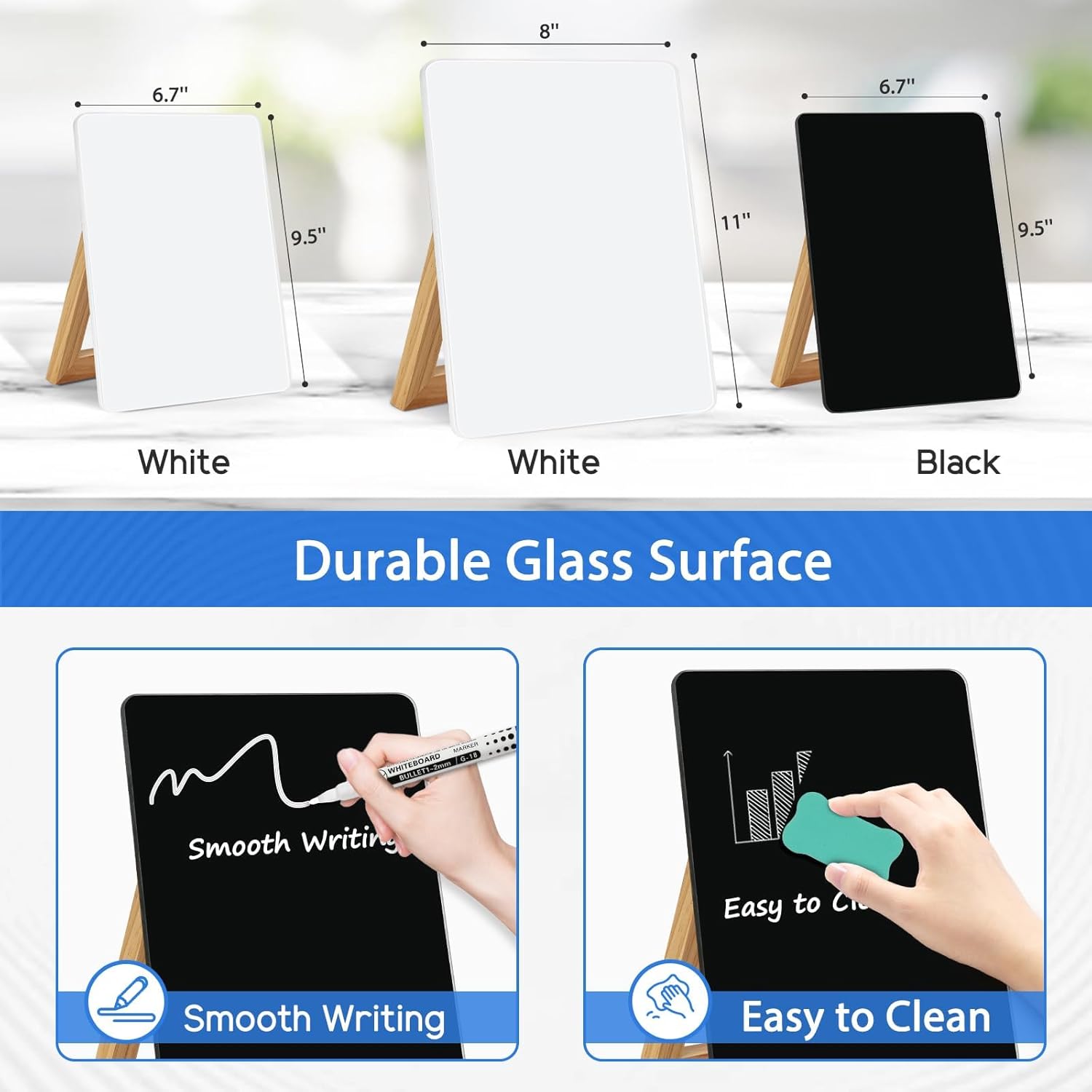 - 【Smart & Portable】WALGLASS Desk Black Dry Erase Board is compact and portable. The reversible wood stand offers the flexibility of a flat writing surface or a stand up on for easy viewing, adapting effortlessly to your needs. With its compact and portable size, this desk whiteboard is easy to carry and helps conserve usable desktop space.