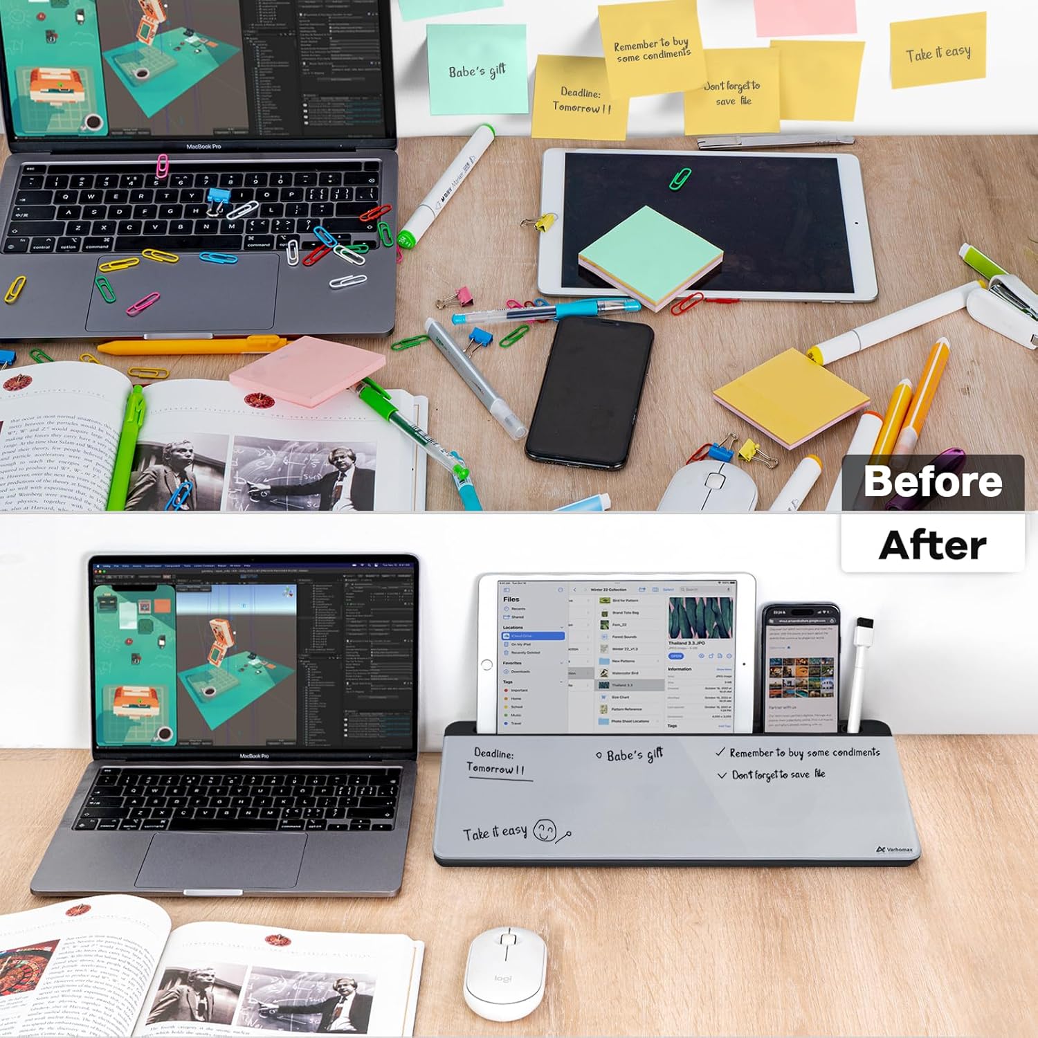 - Built-in Storage: No more clutter on your desk with the inner compartments for storing your supplies like pens, pencils, dry erase markers, paper clips, keys, glasses, and even phones, scissors, staplers, etc. Declutter your desktop and keep it neat and clean