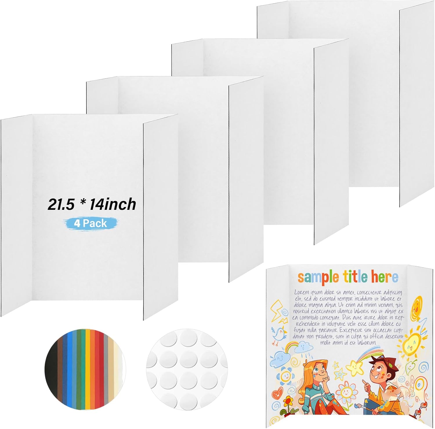 4 Pcs Trifold Poster Board, 21.5x14 inches Small White Poster Board Comes with Sticky Accessories, Corrugated Presentation Boards, Display Board for School Projects, Business Presentations