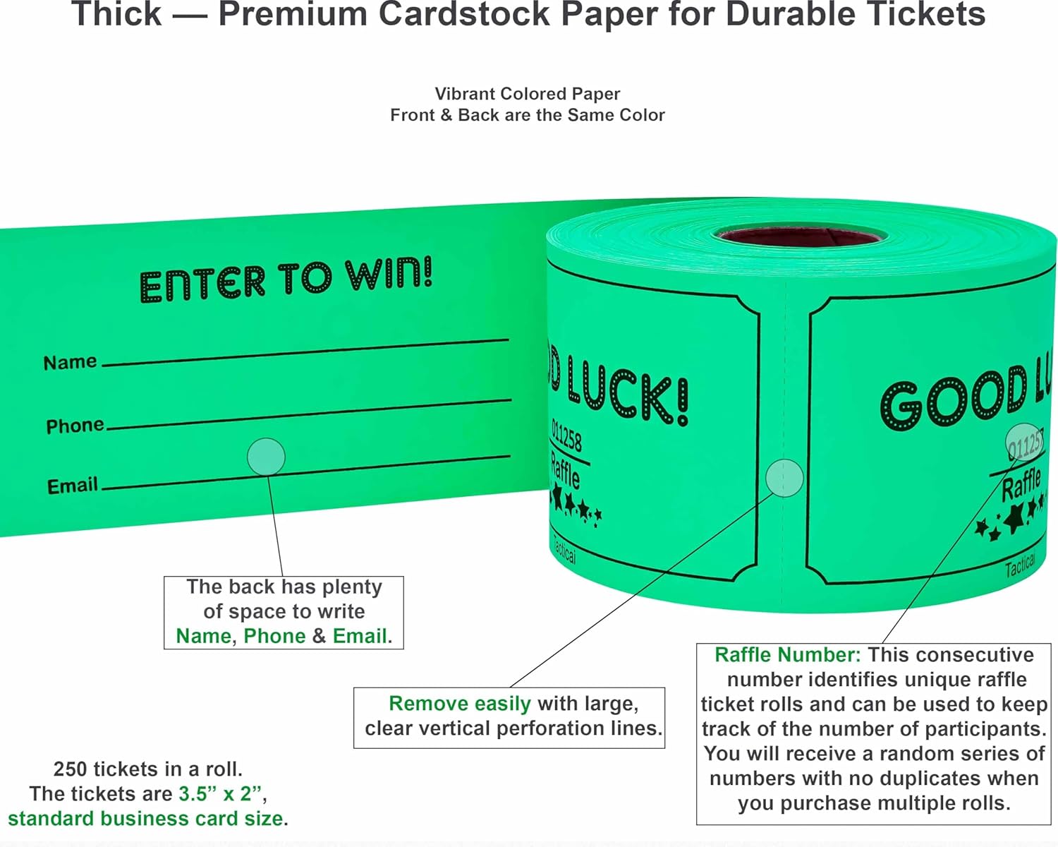 Tacticai 250 Raffle Tickets, Green (1 of 8 Colors), Raffle Cards, Entry Form with Name, Phone & Email for Events, Fundraiser & Prizes
