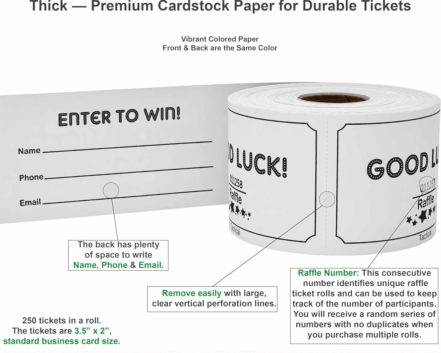 - RAFFLE OPTIONS – Each pack contains 250 raffle cards that can support small, medium, and large events. Easy to write for collection of name, phone number and email address. Each ticket is 3.5” x 2”.