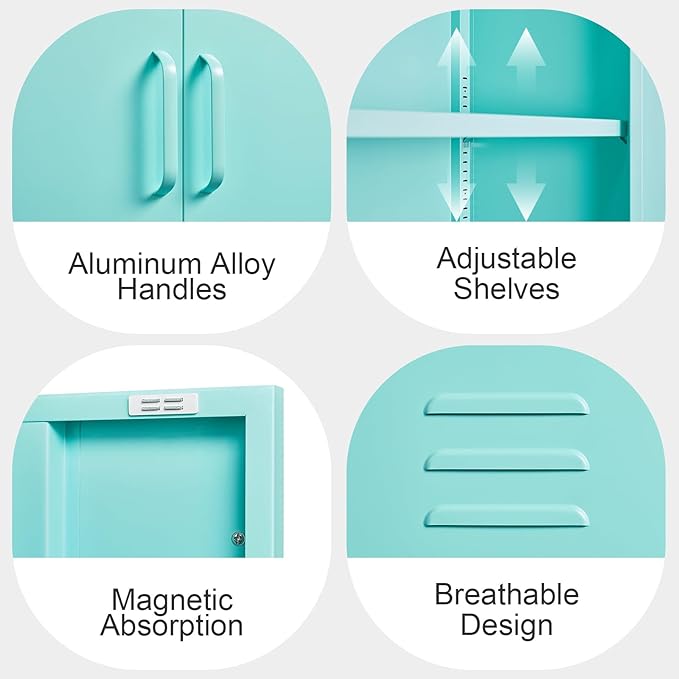 - 【Uniqe Designs】This blue locker cabinet is designed with air vent holes for proper air ventilation,adjustable non-slip feet to adapting to uneven floor and magnets closures on the top of the doors to make sure the doors can be closed tightly