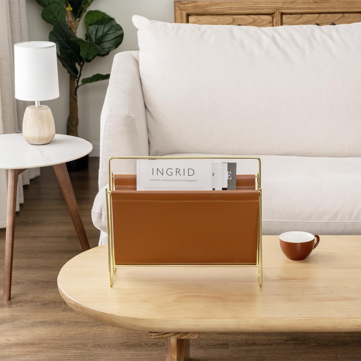 - Mid-Century inspired floor standing magazine holder rack with brass plated metal frame for home living room, bathroom, office, waiting room, or salon