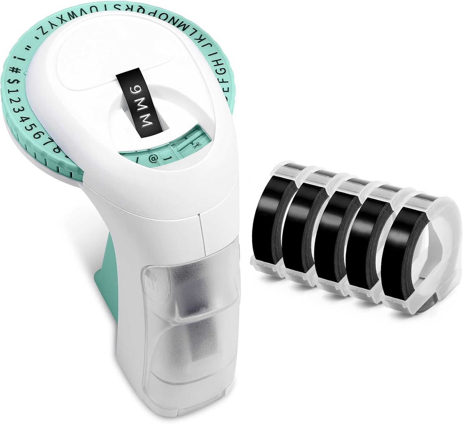 - Features:Handheld & Portable Embossing & Labeling Machine. Sturdy 48 character grinding wheel made of high quality materials, and prints more clearly.2. Ergonomic handle with raised design for a comfortable and effortless grip makes pressing and printing easier.3. Embossing labeling machine's lid comes with a clear frosted design that makes it easy to grip the ribbon