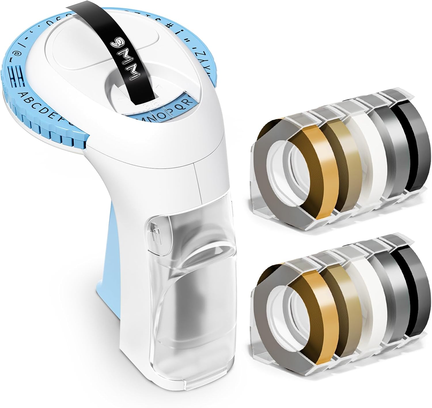 Label KINGDOM Embossed Label Maker, Omega S Blue Embossing Label Maker with 10pk Embossing Label Tape, Retro Labeler Old School Label Printer for Home Office School DIY