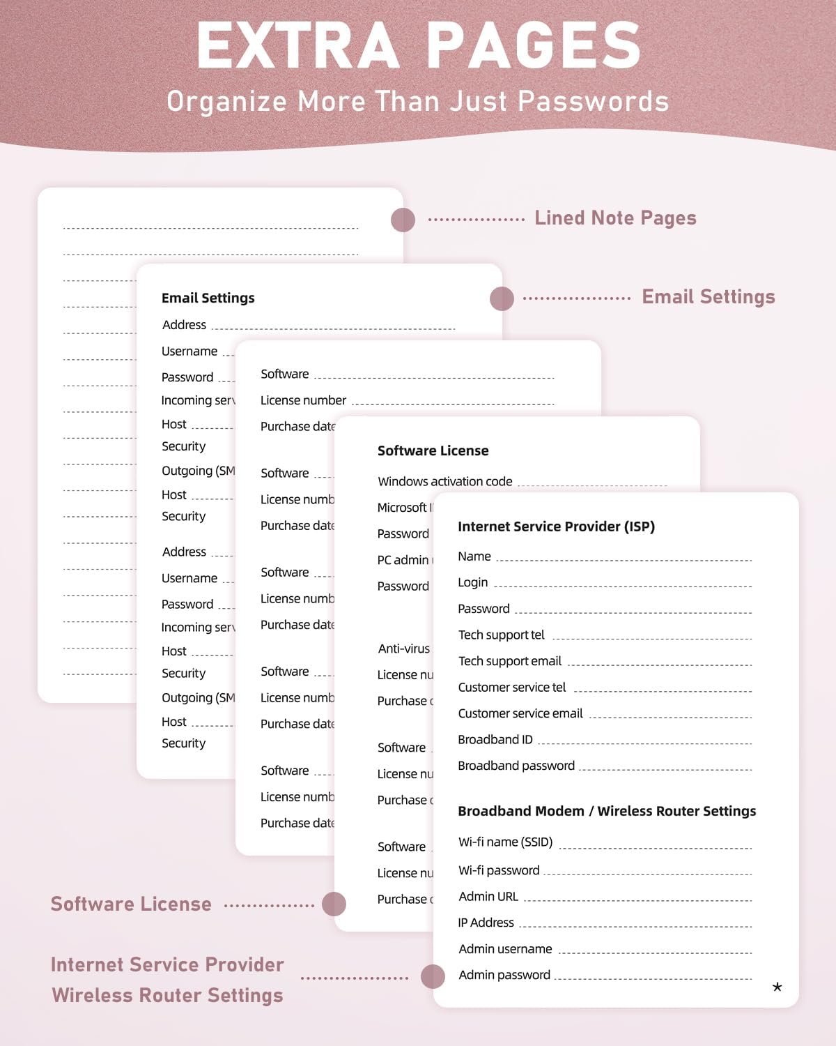 - Master your passwords with Alphabetical Tabs: 24 sections, each storing up to 18 passwords; Ample writing space to update and secure passwords; Add personal hints and notes for extra security; # Index tabs for frequently used passwords; Plus, lined note pages for convenient note-taking