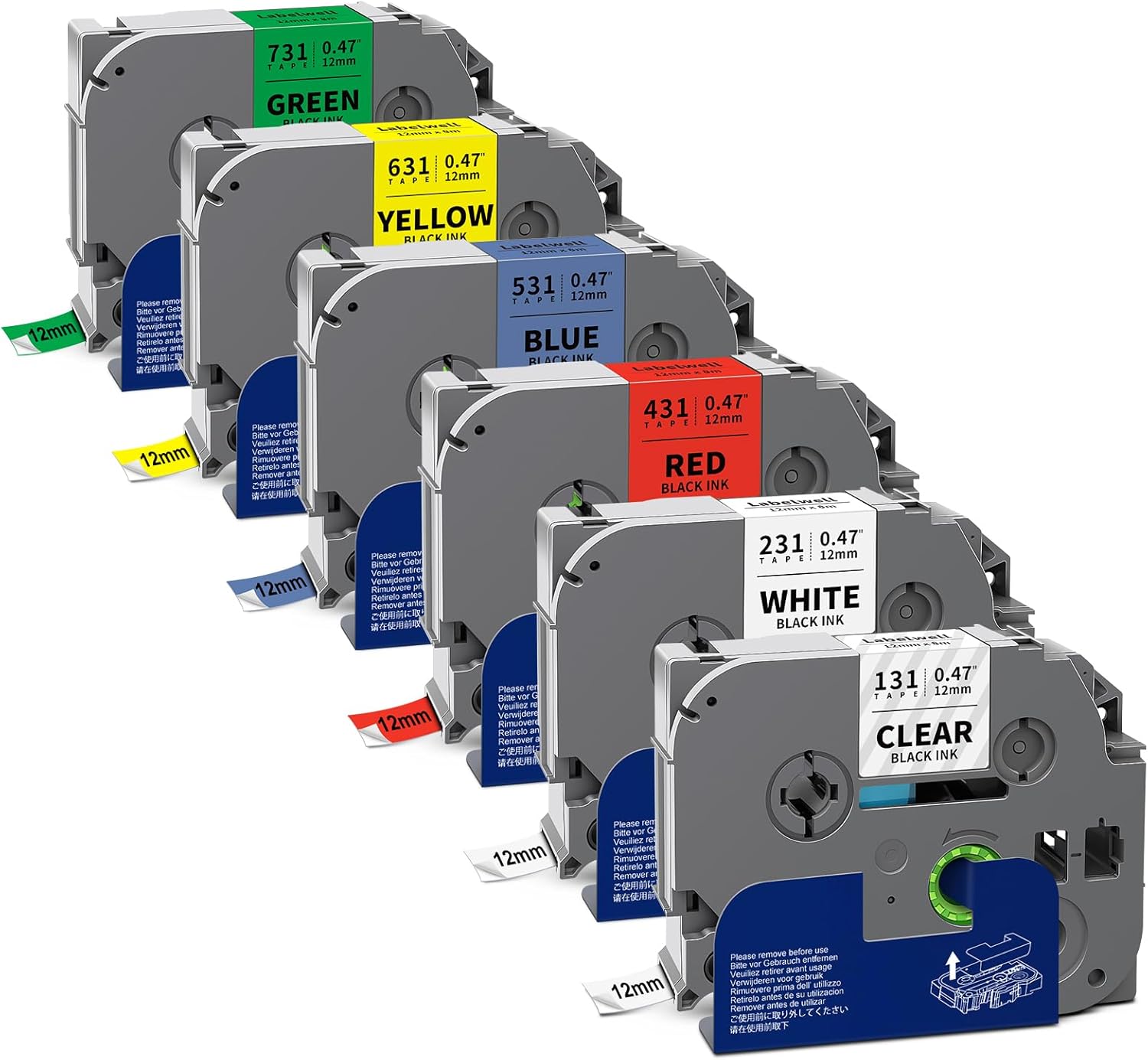 - Package Contents: 6-Pack Replacement for P Touch Label Tape TZe-131 (Black on Clear), TZe-231 (Black on White), TZe-431 (Black on Red), TZe-531 (Black on Blue), TZe-631 (Black on Yellow), TZe-731 (Black on Green), total 6 packs