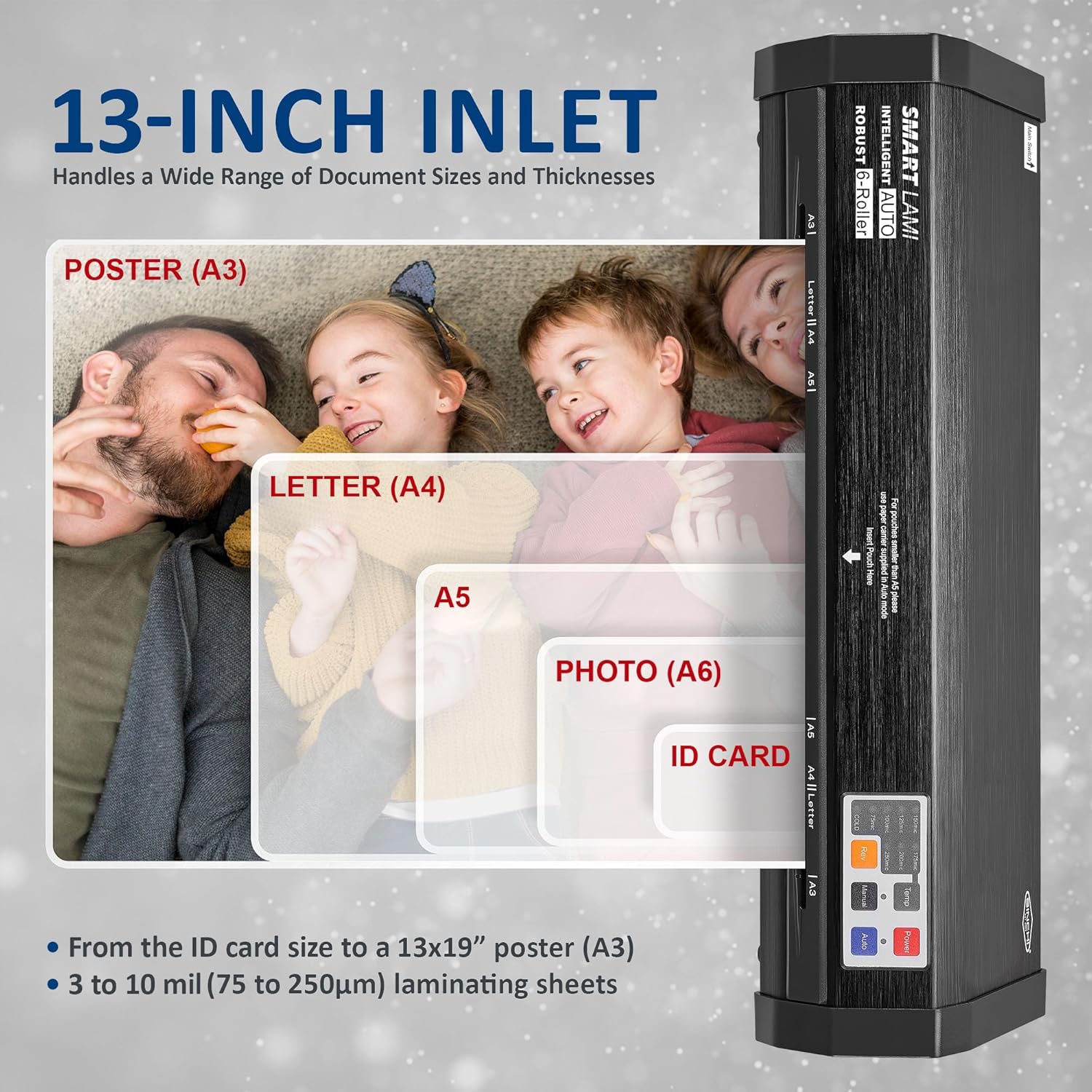 - 【Wide Compatibility】The 13-inch inlet accepts all standard pouches from ID card to 13" x 19" poster size, 3 to 10 mil per side.