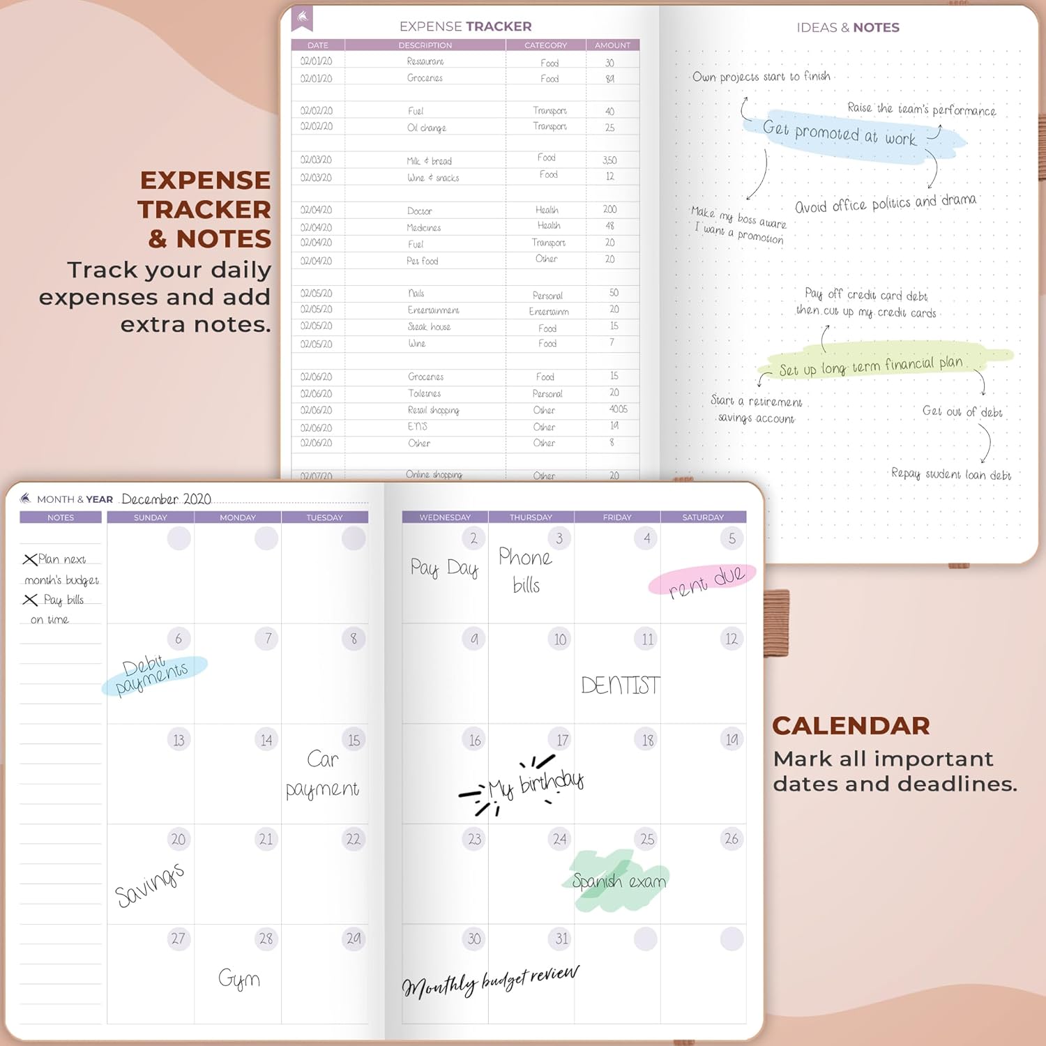 - PREMIUM QUALITY, A5 SIZE & STICKERS: This budget book measures 5.8 by 8.3 inches, and has a durable eco-leather hardcover, thick 120gsm paper, lay-flat binding, pen loop, elastic band, 3 bookmarks, pocket for receipts, stickers, and user guide.