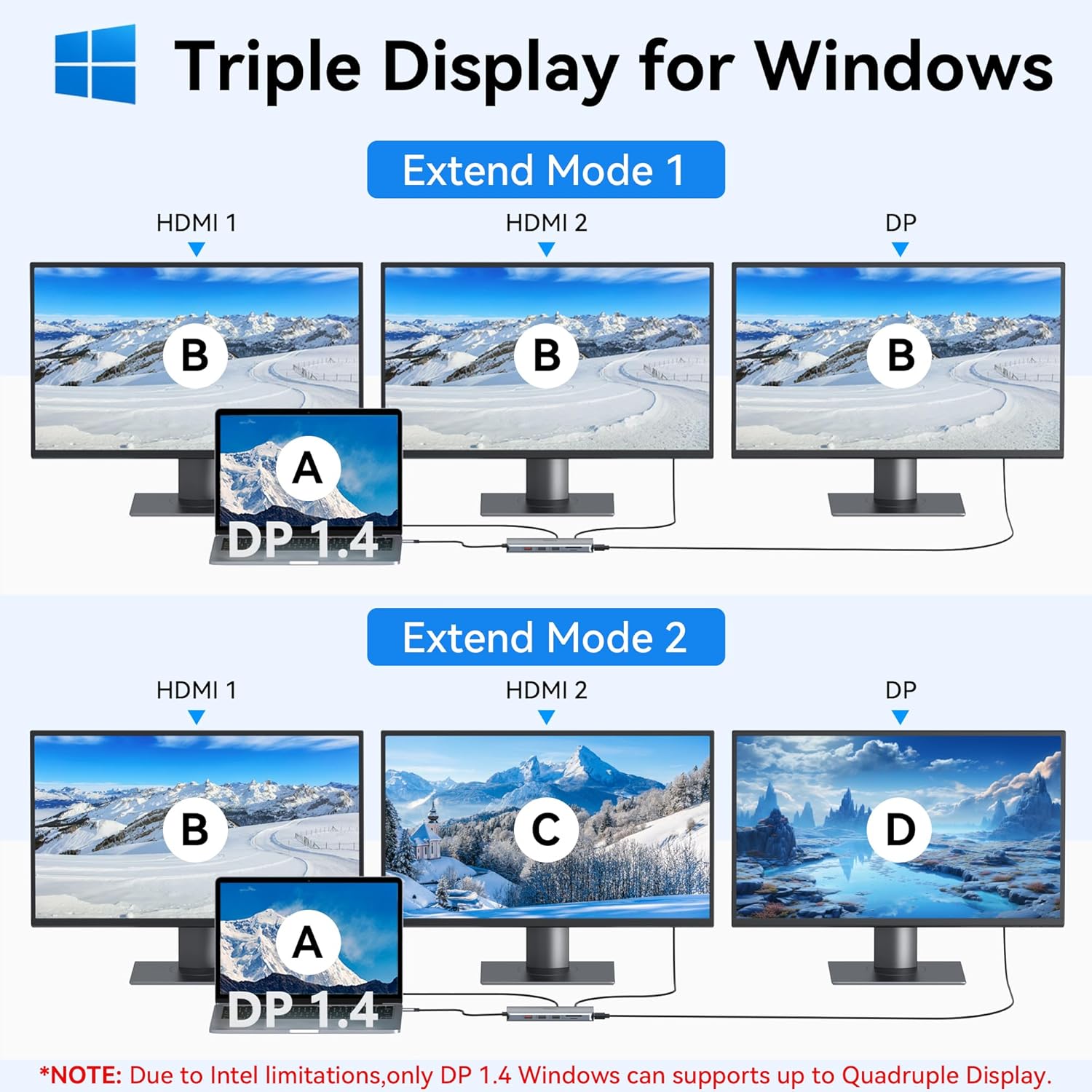 - 【4K Dual HDMI+DP Docking Station 3 Monitors 】This laptop docking station dual monitor ONLY Windows system support MST and SST(Mirror & Extend Mode). Single use HDMI1 or DP can up to 4K under DP1.4 source. The resolution of monitors will be always consistent with laptop if mirror display under Windows system. (Note: MacOS system DOES NOT support triple display. The screens of external monitors are the same, no matter they are displayed in mirror mode or extended mode.)
