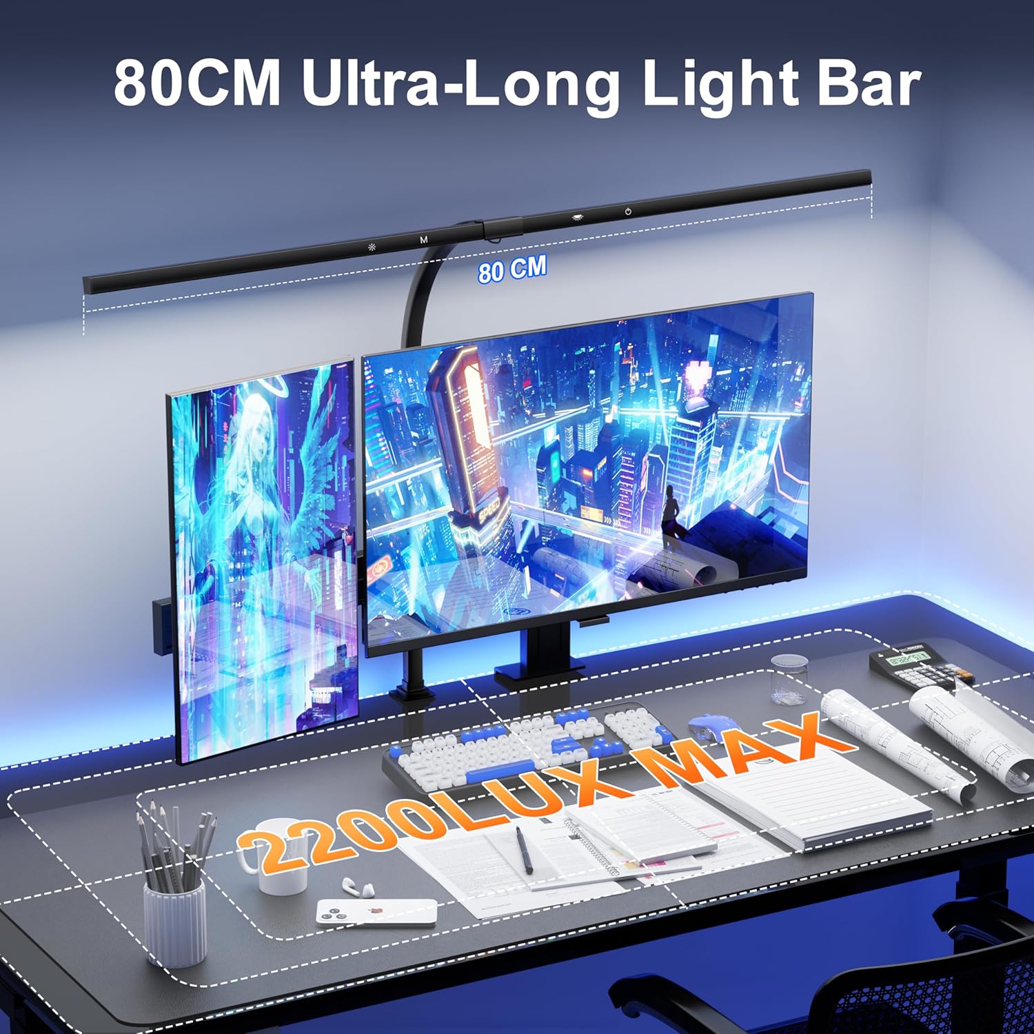 - 【Ultra-Wide & Super Bright Illumination】24W 80cm super wide LED desk light bar, Large light-emitting area for full desk coverage. Ideal for studio, office, monitor, drawing, sewing, crafting, painting, and reading.
