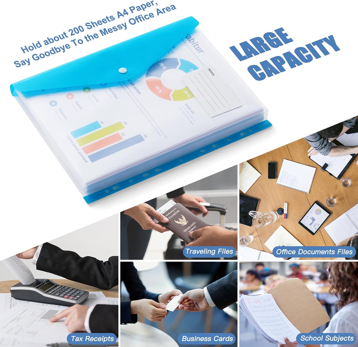 Binder Pocket Organizer Folders, 12 Pack Expandable Files Bag Plastic Envelopes Binder Folders with 11 Holes for 2/3/4 Ring Binder, Document Pouch with Snap Button and Label for School Office Home