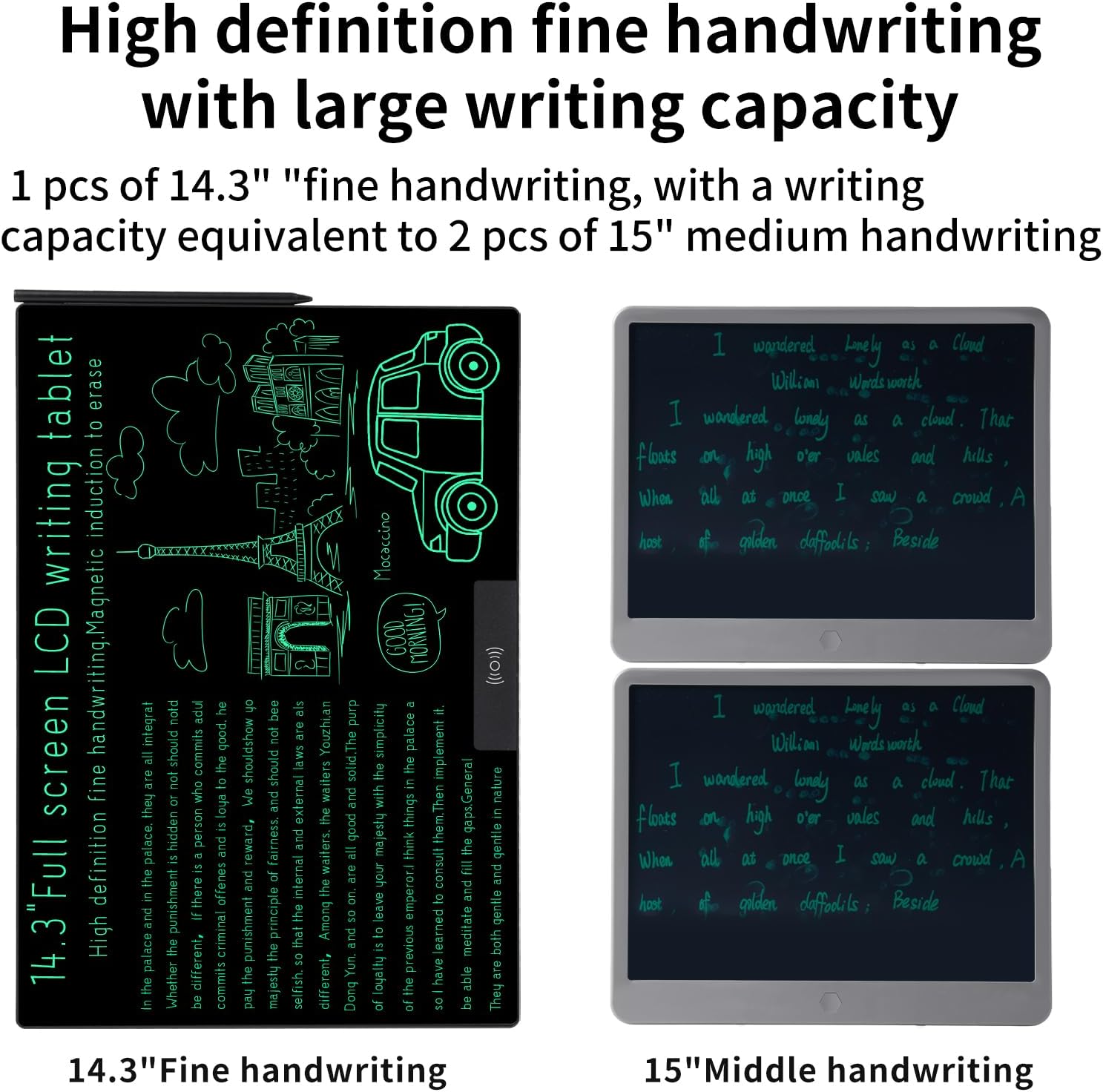 - Ultra-Slim Design:Our LCD writing tablet features a phone-like slim body (only 0.2 inch thin) with rounded corners, crafted from durable ABS material. At just 0Bigger Writing Space: The tablet offers an expansive writing space, providing more room for content compared to traditional 16-inch LCD writing tablets. The new cleaning button design prevents accidental activation, while the edge structure stabilizes the pen more securely than magnetic alternatives, ensuring a steadier writing experience. These improvements enhance the tablet's overall usability and writing capabilities. .76 lb, this lightweight digital notepad fits perfectly in one hand.