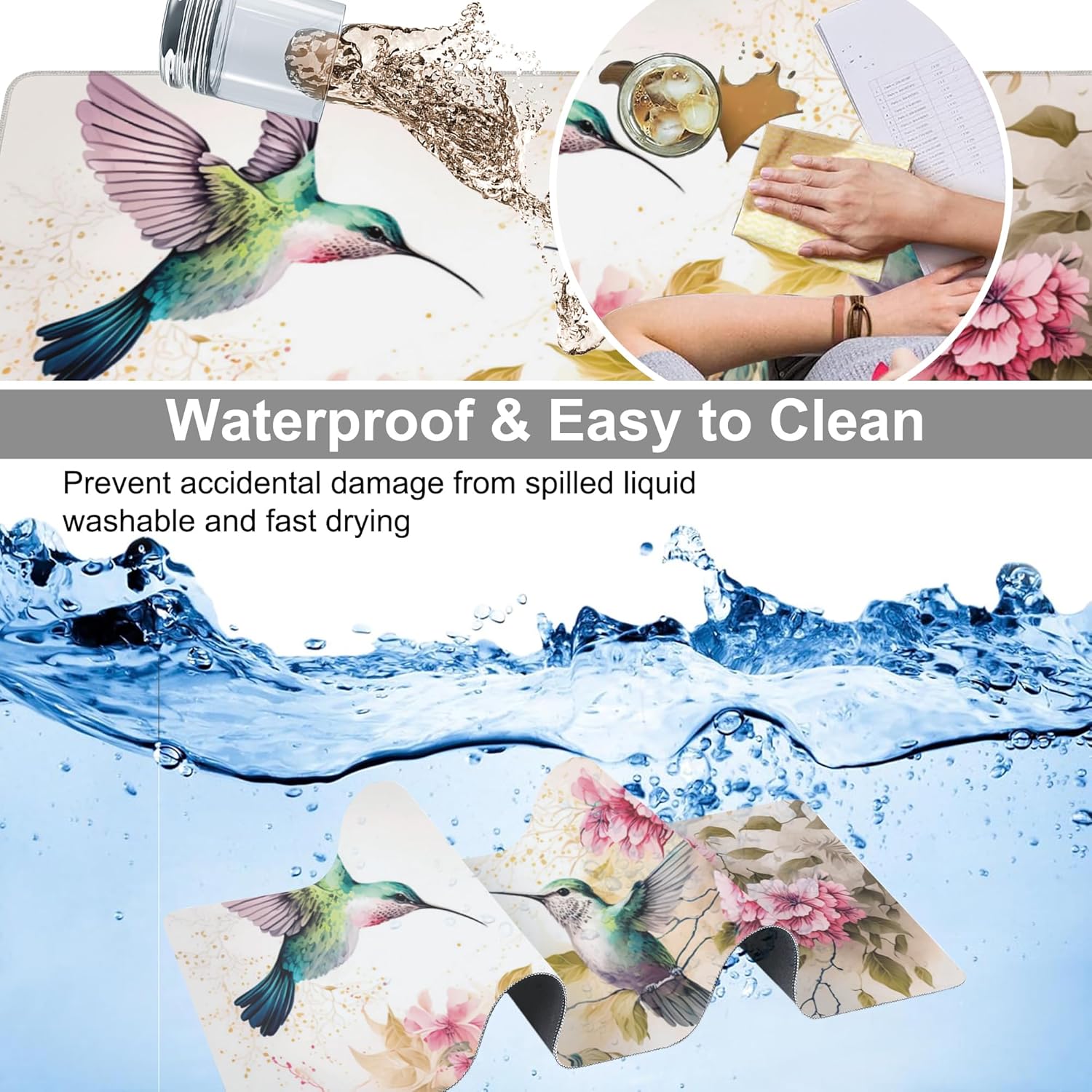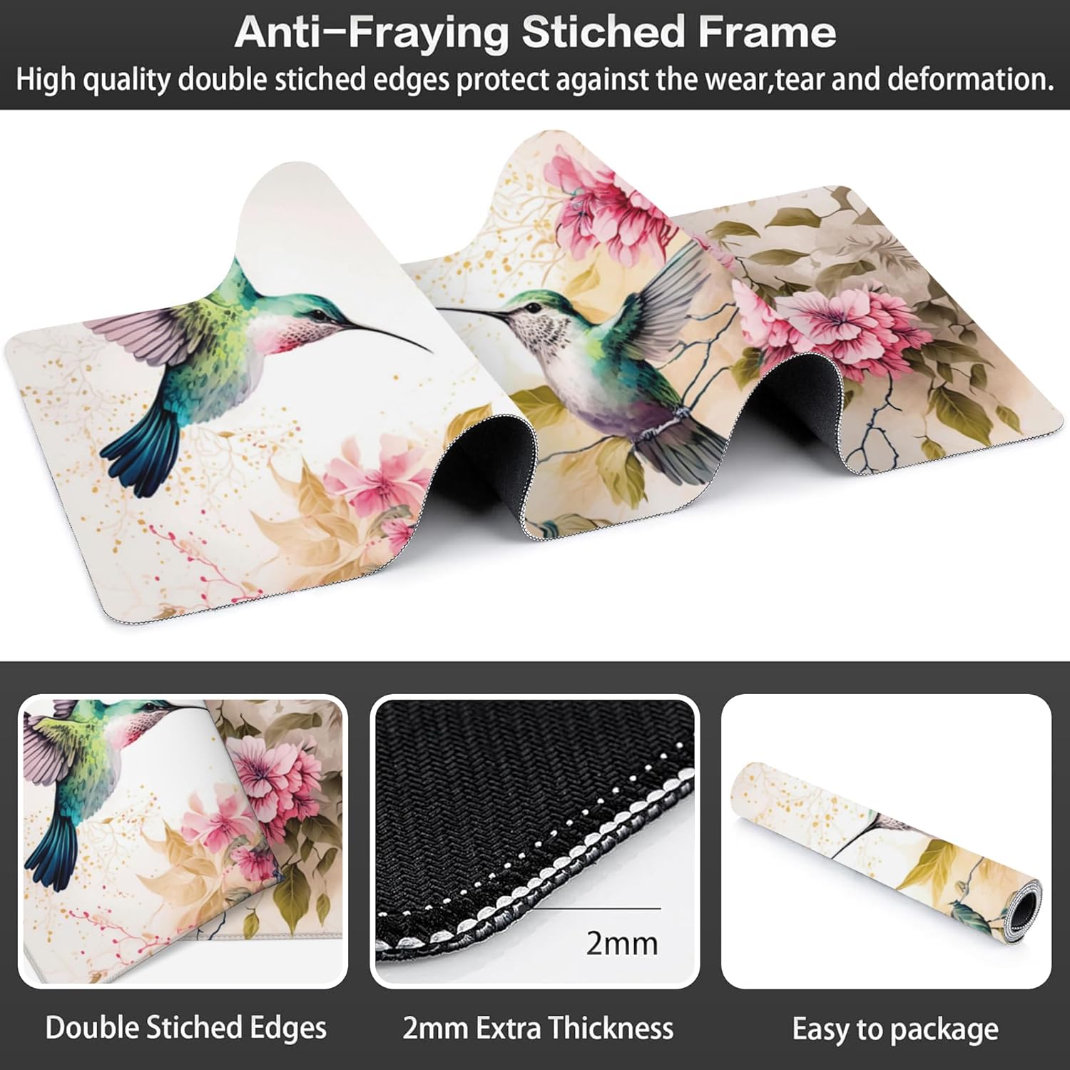 Desk Mat, Pink Flowers and Colibri Birds Extended Large Gaming Mouse Pad for Desk XXL, Non-Slip Rubber Base Stitched Edges Long Computer Keyboard Desk Pad Mouse Mat for Home Office Gaming 35.4"X15.7"