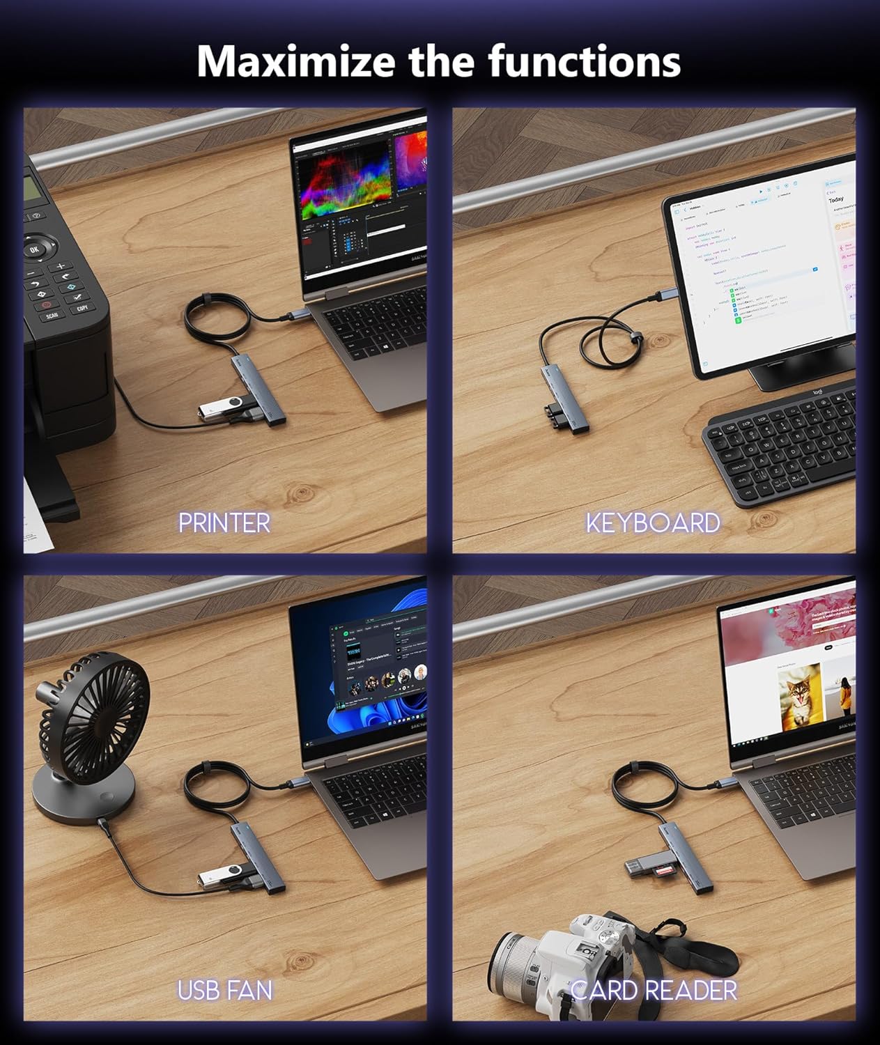 - 【Widely Compatibility】No driver is required; simply plug and play. Mac USB C Hub Adapter is compatible with Windows, MacOS, Linux, iPadOS, iOS, and Android. Also works with most USB-C or Thunderbolt devices such as MacBook Pro/MacBook Air 2022/2021, iPad Mini 6/5, iPad Pro/iPad Air 5/4, Surface Book 2, XPS 17/15, iPhone 15 Use and other smartphones/laptops/tablets.