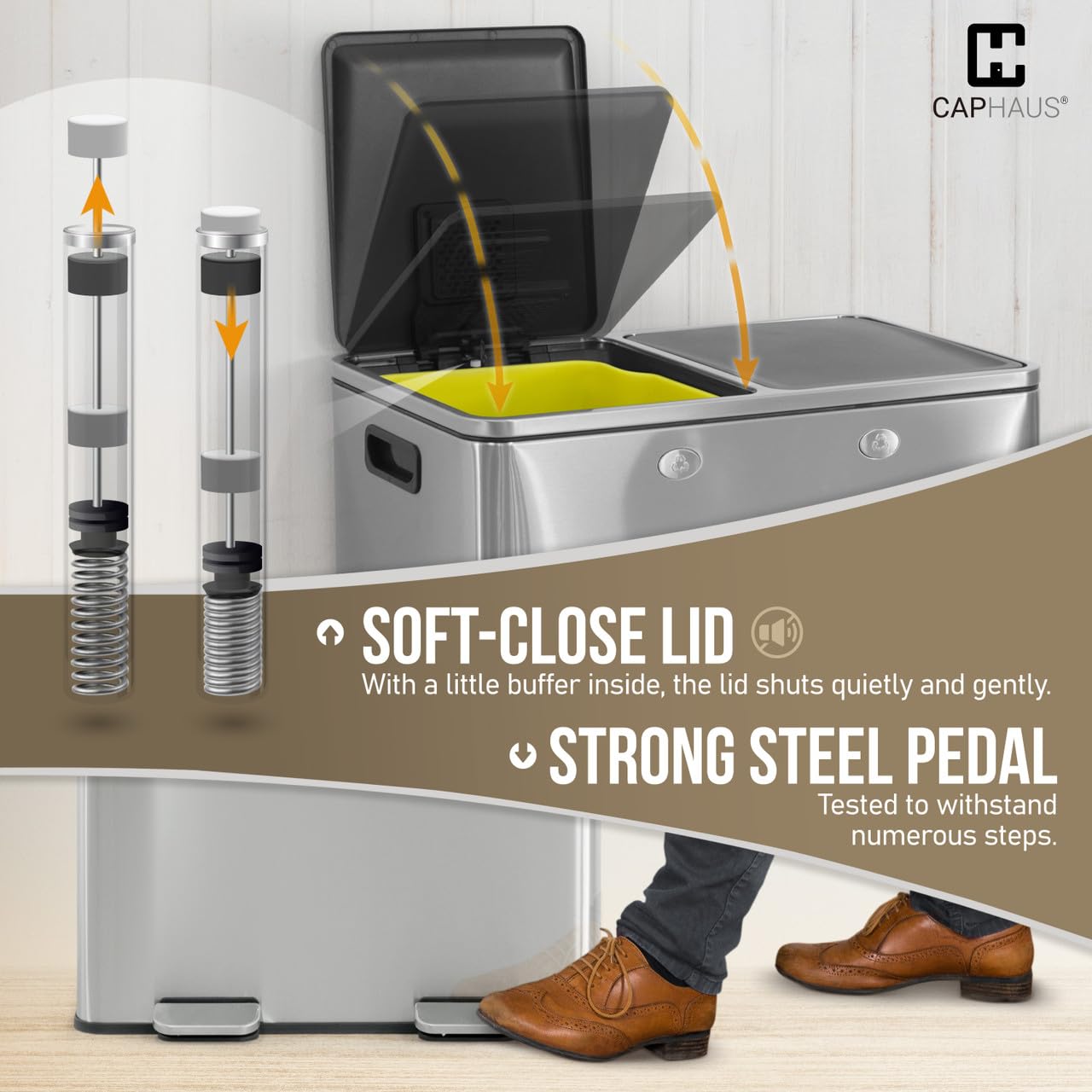 - 🗑️ Durable Construction - This premium dual trash can is engineered with double lids featuring a soft-close design, ensuring a quiet and controlled closure every time. Additionally, the double pedals are built to withstand numerous steps, providing durability and reliability for long-term use. With this robust construction, you can confidently manage your waste without worrying about wear and tear, making it a practical and efficient solution for any home or workspace.