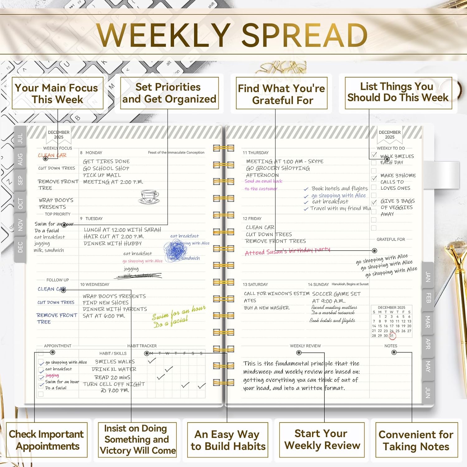 - 📒 Enhanced Weekly Pages: Weekly pages feature sections for focus, priorities, appointments, habits, to-do lists, gratitude, and reviews, alongside generous note space. Stay organized, motivated, and productive with detailed daily planning and activity tracking in the 2025-2026 weekly planner.
