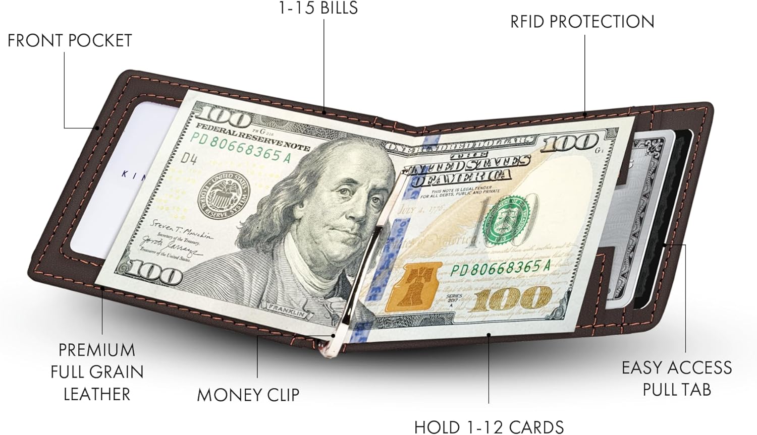 - Sleek & Accessible Design: This leather mens wallet with a money clip features a front thumb slide and a pull tab to conveniently access your most used cards. Measures 3" x 3.75" x .35" inches. Equipped with RFID blocking technology to protect your credit cards and personal information from electronic pickpocketing.