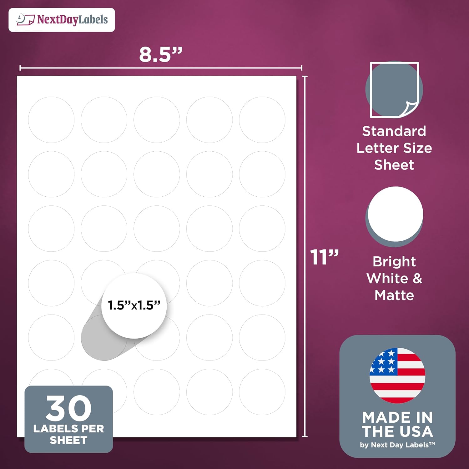 NextDayLabels - 1.5 Inch Round Labels - Matte White Blank Laser/Inkjet Printer Stickers (500 Sheets, 30 Per Sheet, 15000 Circle Stickers)