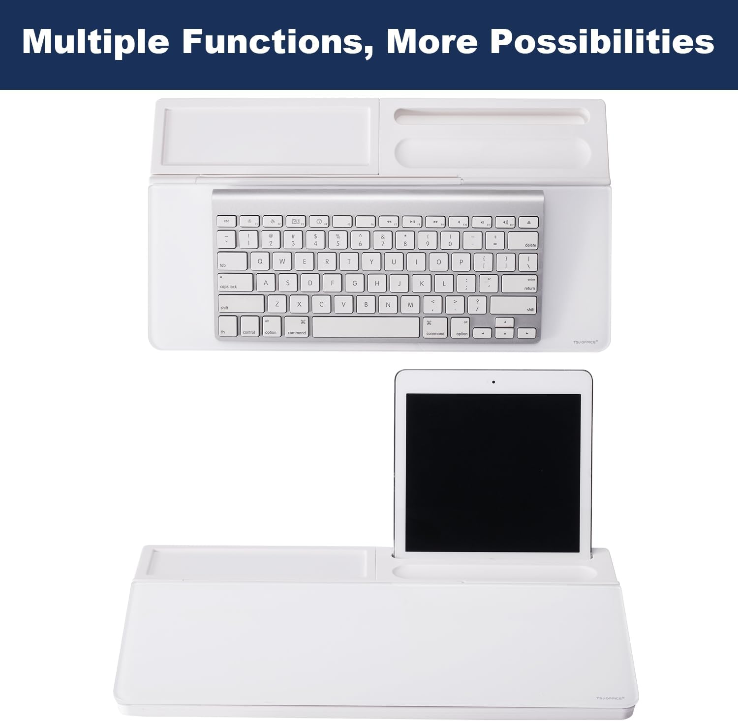 - HIDDEN STORAGE & PAD/MOBILE TRAY: De-clutter your desk by storing markers, magnetic eraser and other desktop accessories in the opening drawer or place markers on the accessory tray for quick access. And one more long tray on the top of the dry erase white board for your pad or mobile.