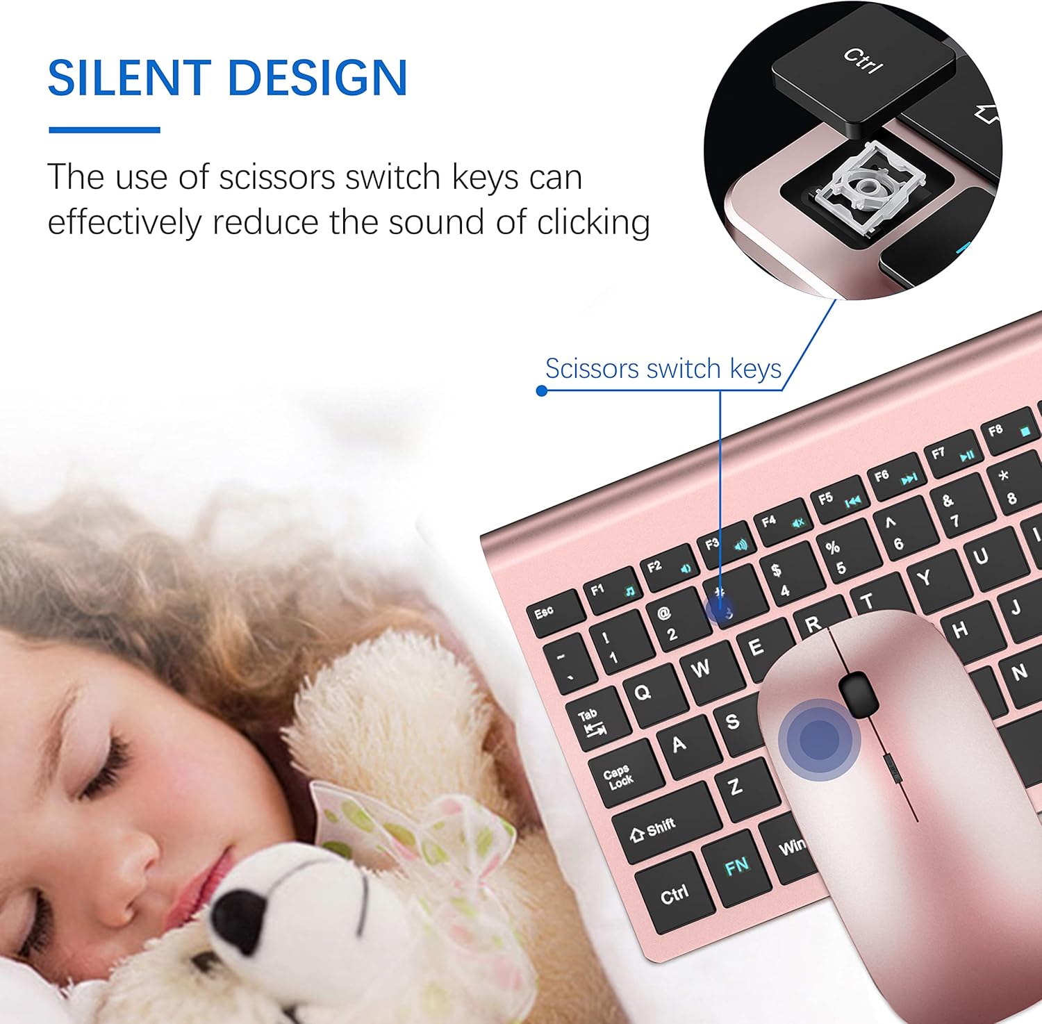 Wireless Keyboard and Mouse Ultra Slim Combo, TopMate 2.4G Silent Compact USB 2400DPI Mouse and Scissor Switch Keyboard Set with Cover, 2 AA & 2 AAA Batteries,for PC/Laptop/Windows/Mac-Rose Gold Black