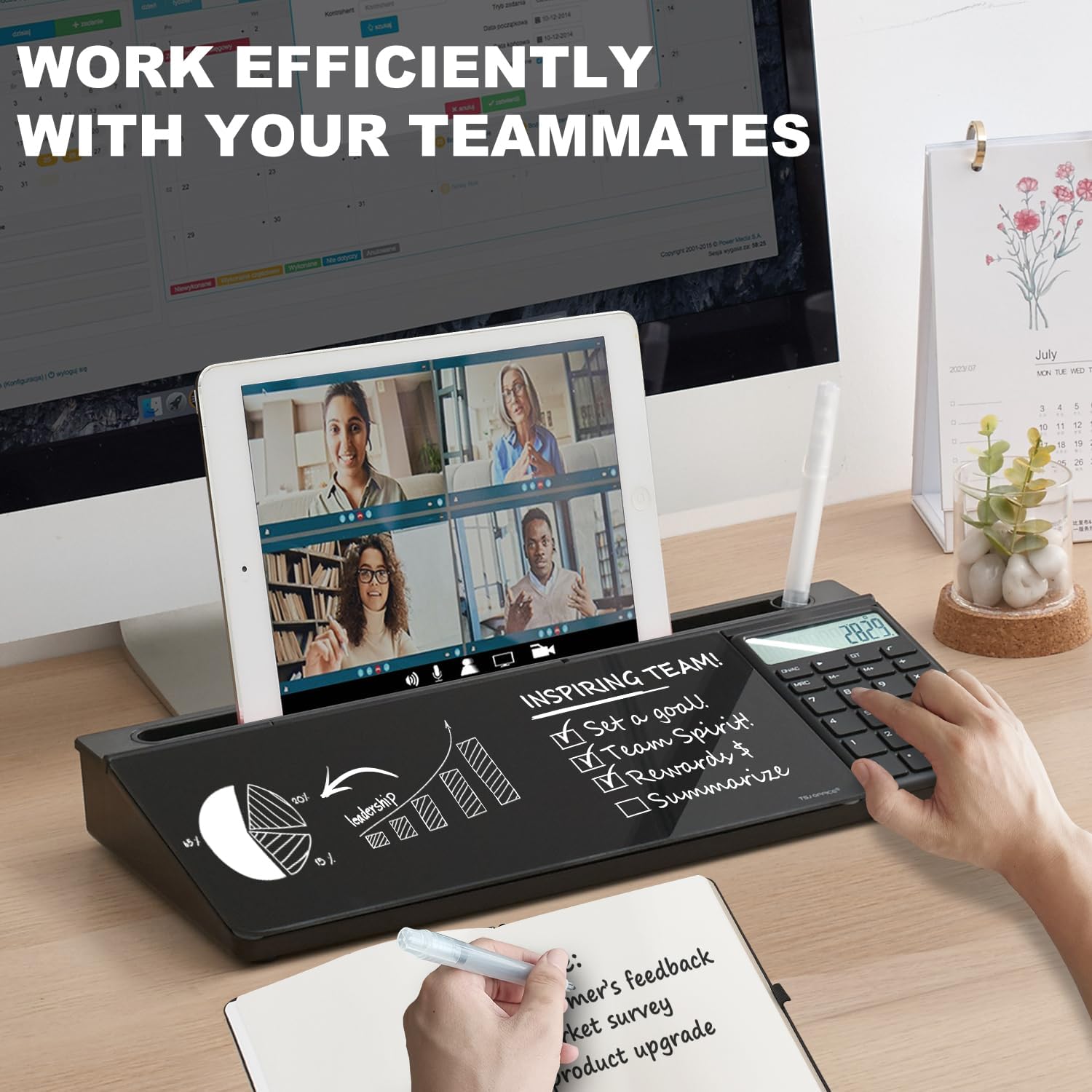 - CONTAINS EVERYTHING YOU NEED - This small glass whiteboard kit includes a W 15.8 " x D 7.1 " x H 1.9 " Desktop glass whiteboard, 4 markers and 1 eraser and A 12-digit standard function calculator. It comes with everything you need. Enjoy the standing whiteboard as soon as you receive it!
