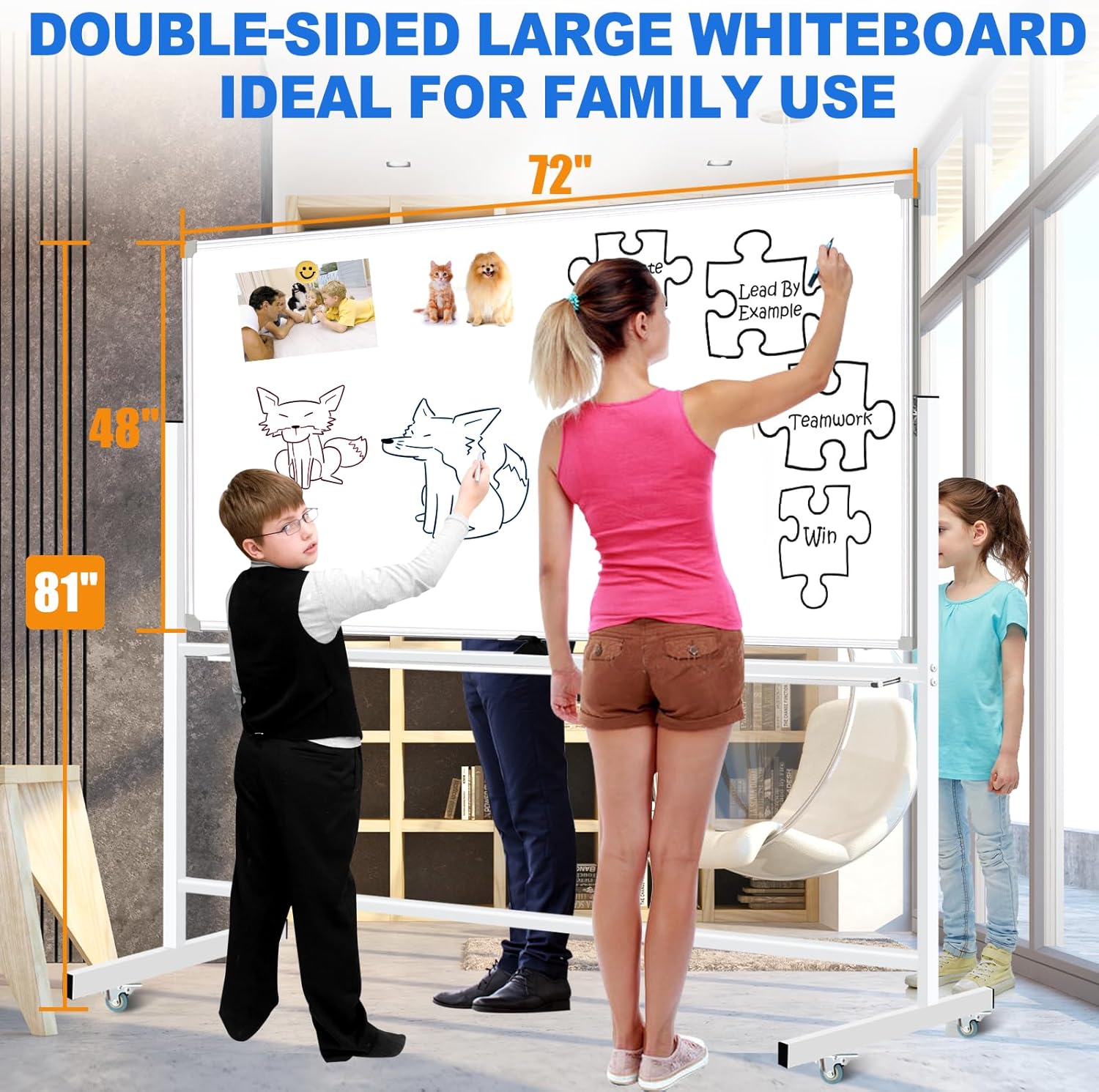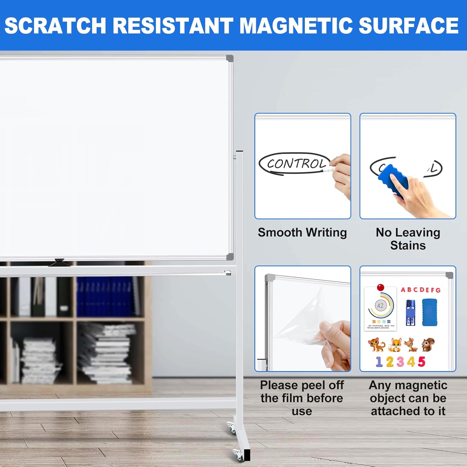 Magnetic White Board Dry Erase Whiteboard with Rolling Stand 72"x48" Double-Sided Mobile Large White Board on Wheels, Including 3 Magnetic Erasers, 7 Markers, 30 Magnets