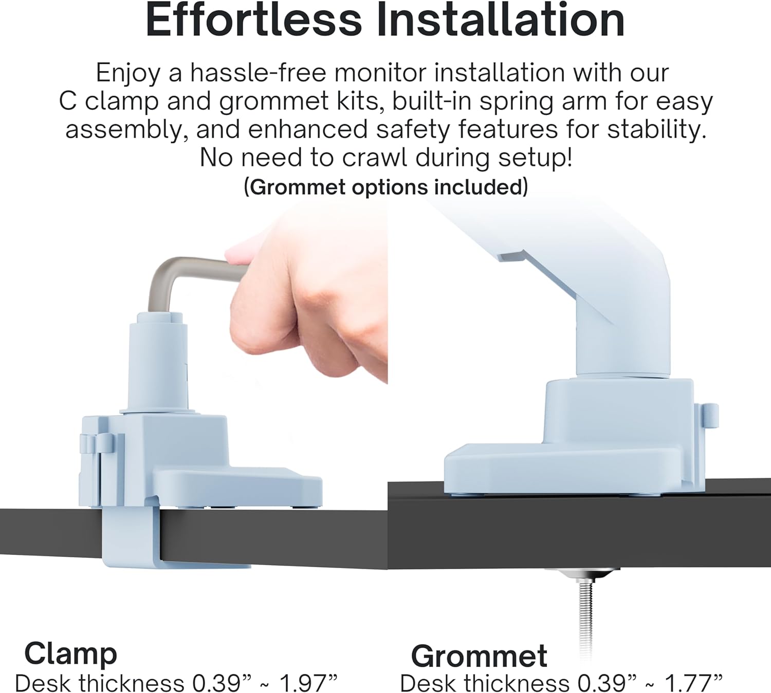 - Desk mounted design: Frees up valuable desk space, creating a more organized and spacious work area. Choose between a C-Clamp configuration (default) or by grommet installation.