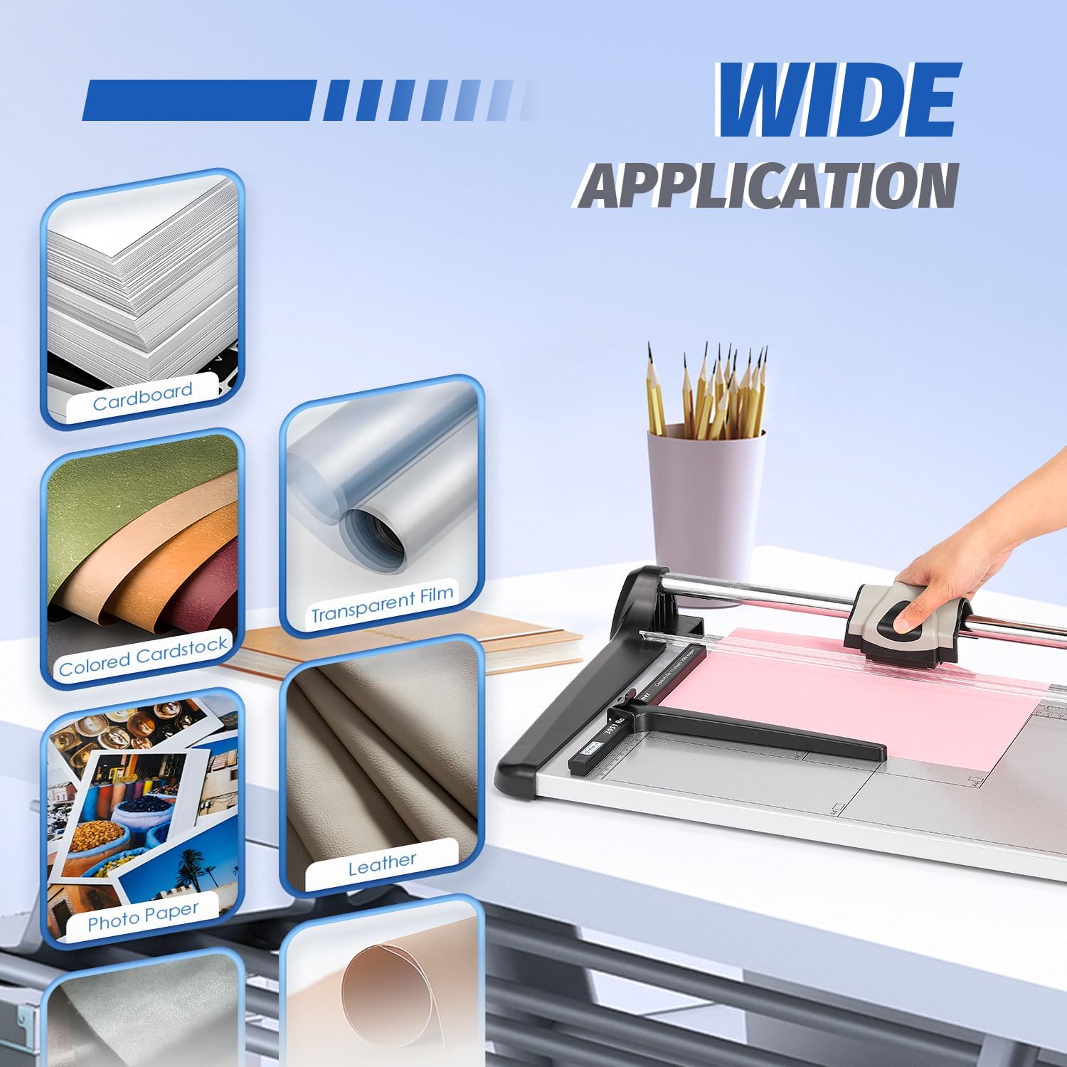 - Wide Application---This rotary paper cutter has a wide range of applications. It can be used for photos, laminating card, cardboard, thin leather, etc, which can especially meet the needs of cutting drawings.