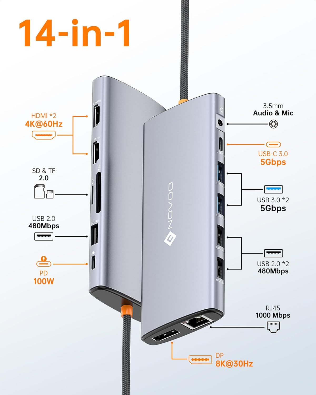 - 💞【14-in-1 USB C Docking Station】NOVOO USB C HDMI multiport hub equipped with 1*DP port, dual 4K HDMI ports, 2*USB A 3.0 ports, 1*Gigabit RJ45 port, 1*USB C PD100W charging port, 1*USB C data transfer port (speeds up to 5Gbps) and 3*USB 2.0 ports, SD/Micro SD card reader and 3.5mm microphone/audio port. Plug and play, no need to install any drivers or software.