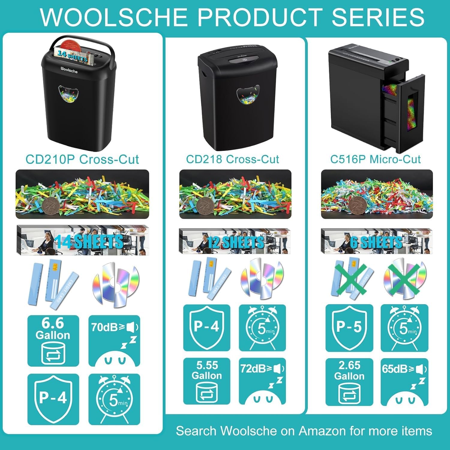 - 【P-4 High Security Level】Woolsche crosscut paper shredder for office,shred max 14-sheet paper at a time,cut paper into 5/32" x 1-13/32"(4x35mm), no need to remove staples or clips.